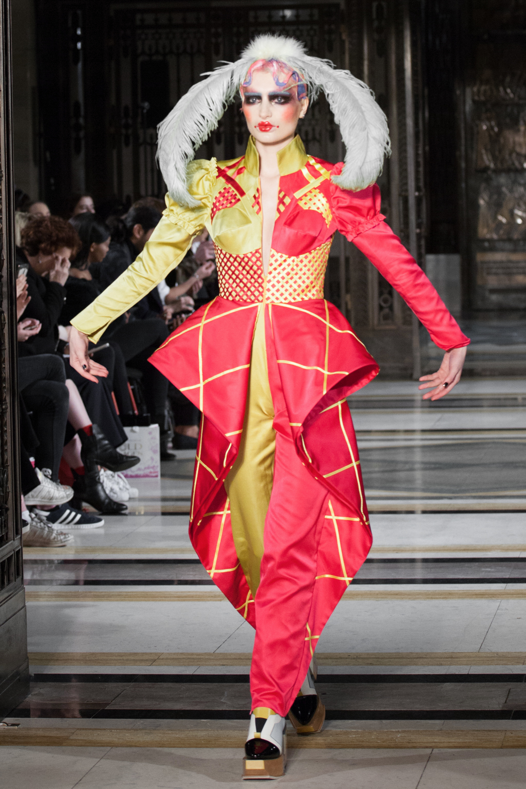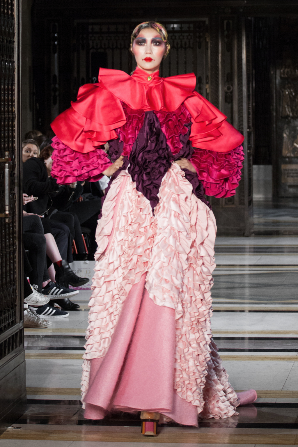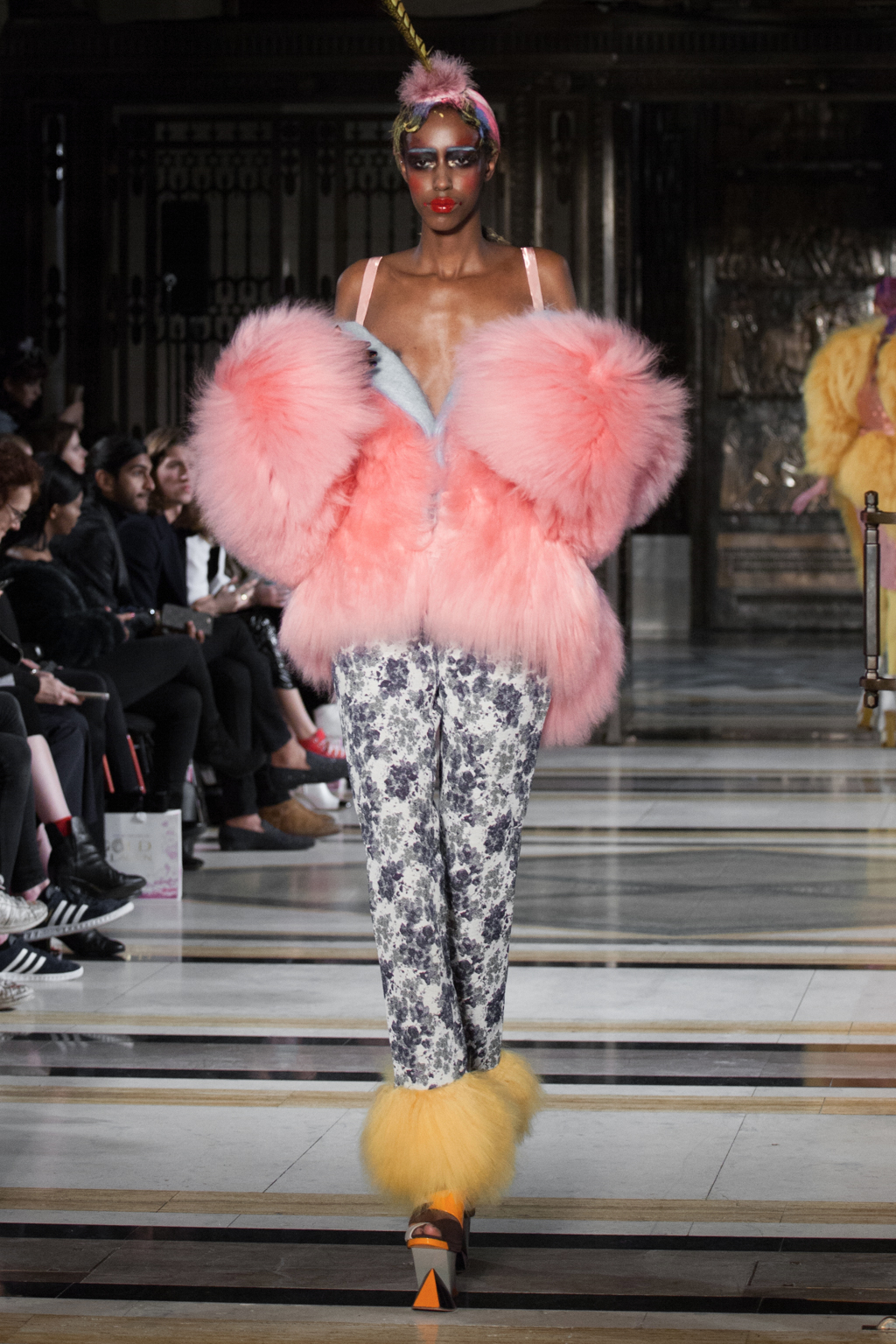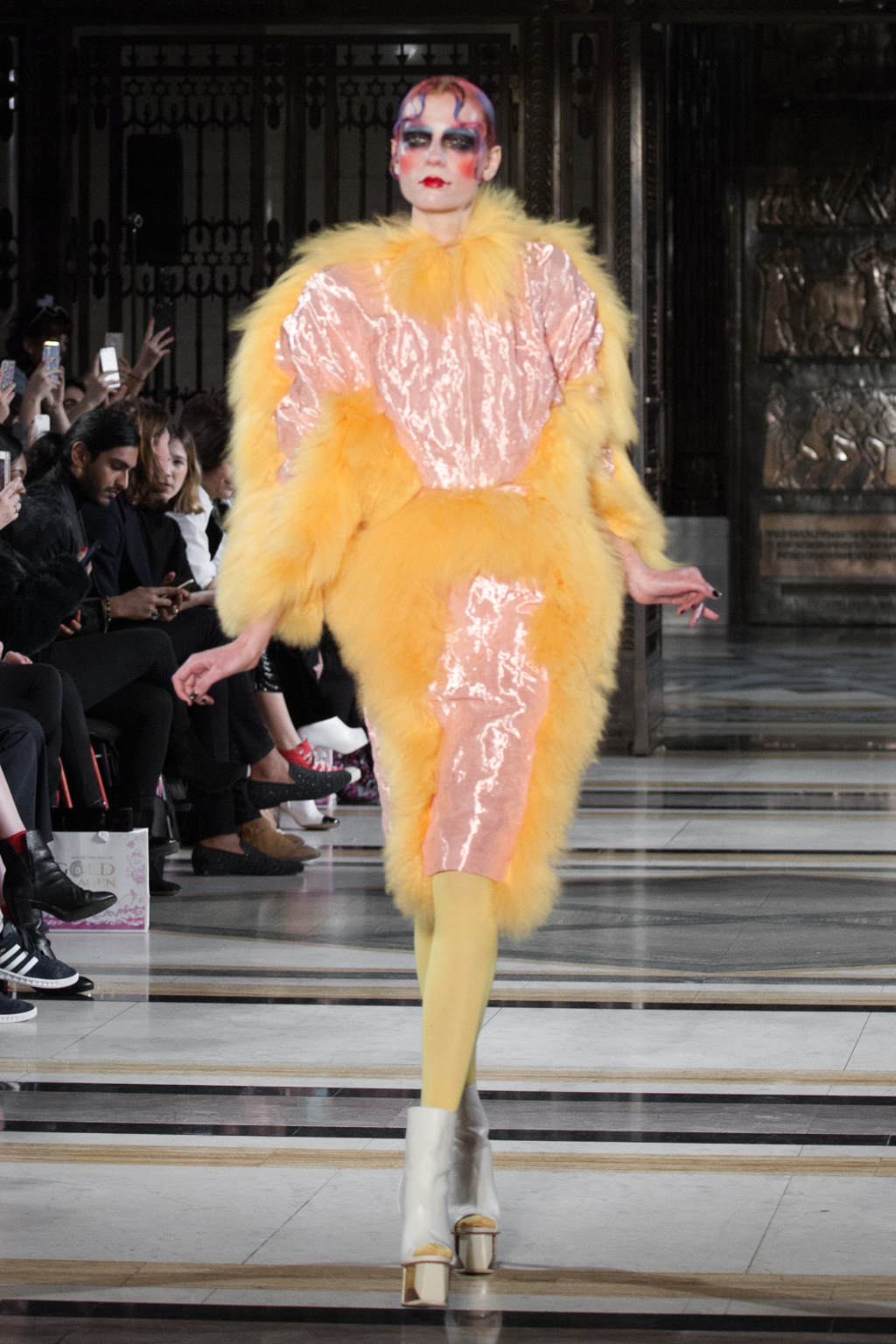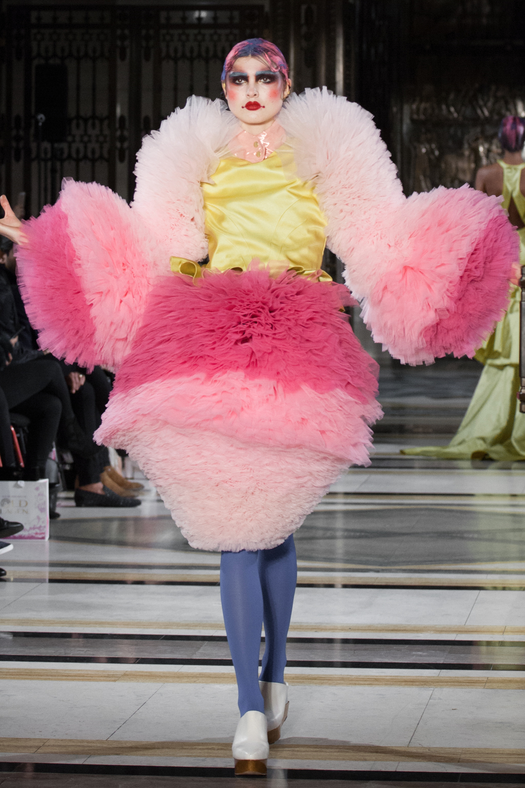 Huge structures of ruffles, feathers and fur transported you to a cabaret on acid. A colour palette of midnight blue, fuchsia, canary yellow, turquoise and pinks brought the brilliantly gaudy quality of the circus to each extravagant, avant-garde creation.