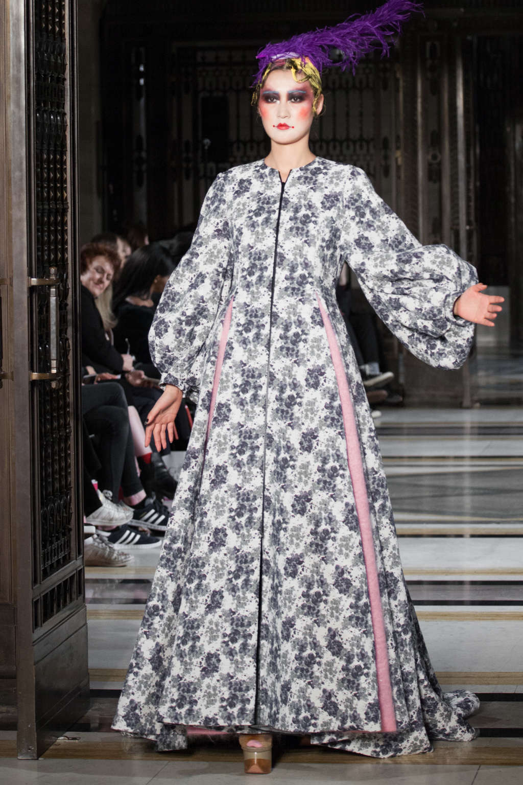 Whilst it was all about spectacle, the more-is-more mentality, the over-the-top, and the vivid colours, the volume was turned down ever so slightly with a tent-like gown with puffed up sleeves and a muted floral print in cream and blue-grey, almost resembling a Tudor-esque costume fit for a queen.