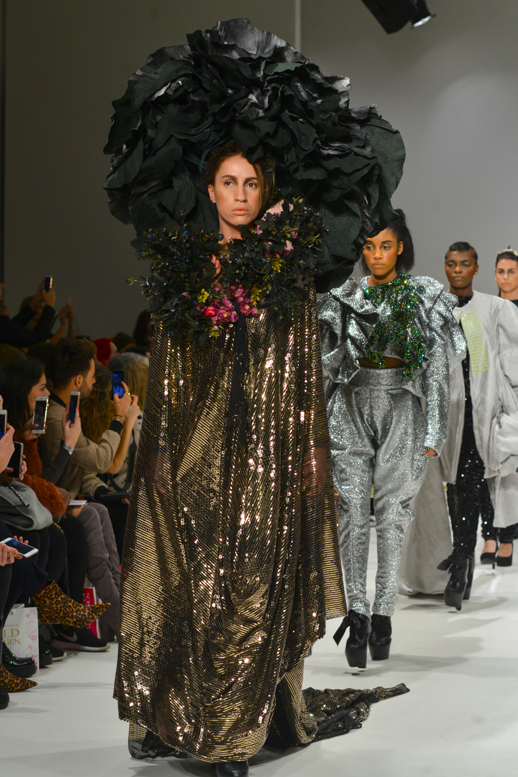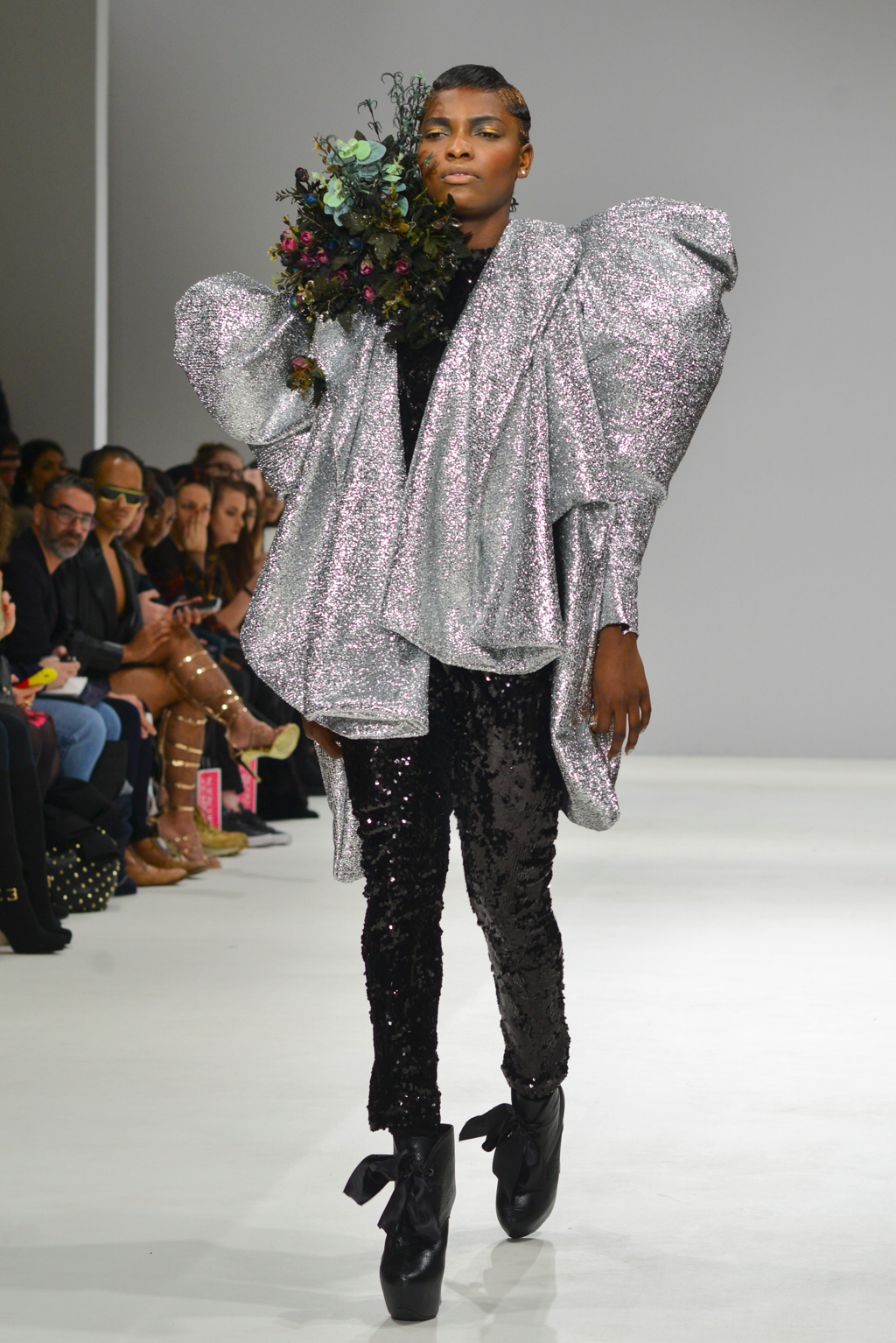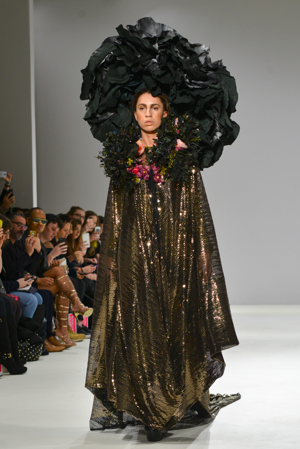 This changed to heavy rock music as the first model began to walk, dressed in a flowing gold glitter cape, with a flower garland for a collar and an impressive black paper flower on her head. The following look featured a black sequin bodysuit with a regal, gold cape across the shoulders. The running theme throughout the collection appeared to be a strong silhouette, reminiscent of Renaissance fashion, with voluminous shapes, powerful shoulders and layering of material. This was juxtaposed with the choice of colours or fabrics, with most of the outfits in metallic silver, gold or bronze with glittering sequins in abundance, creating a modern twist to these historically majestic colours.