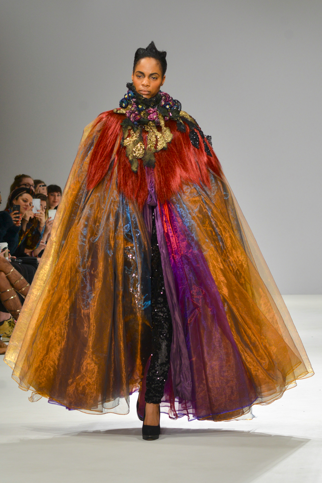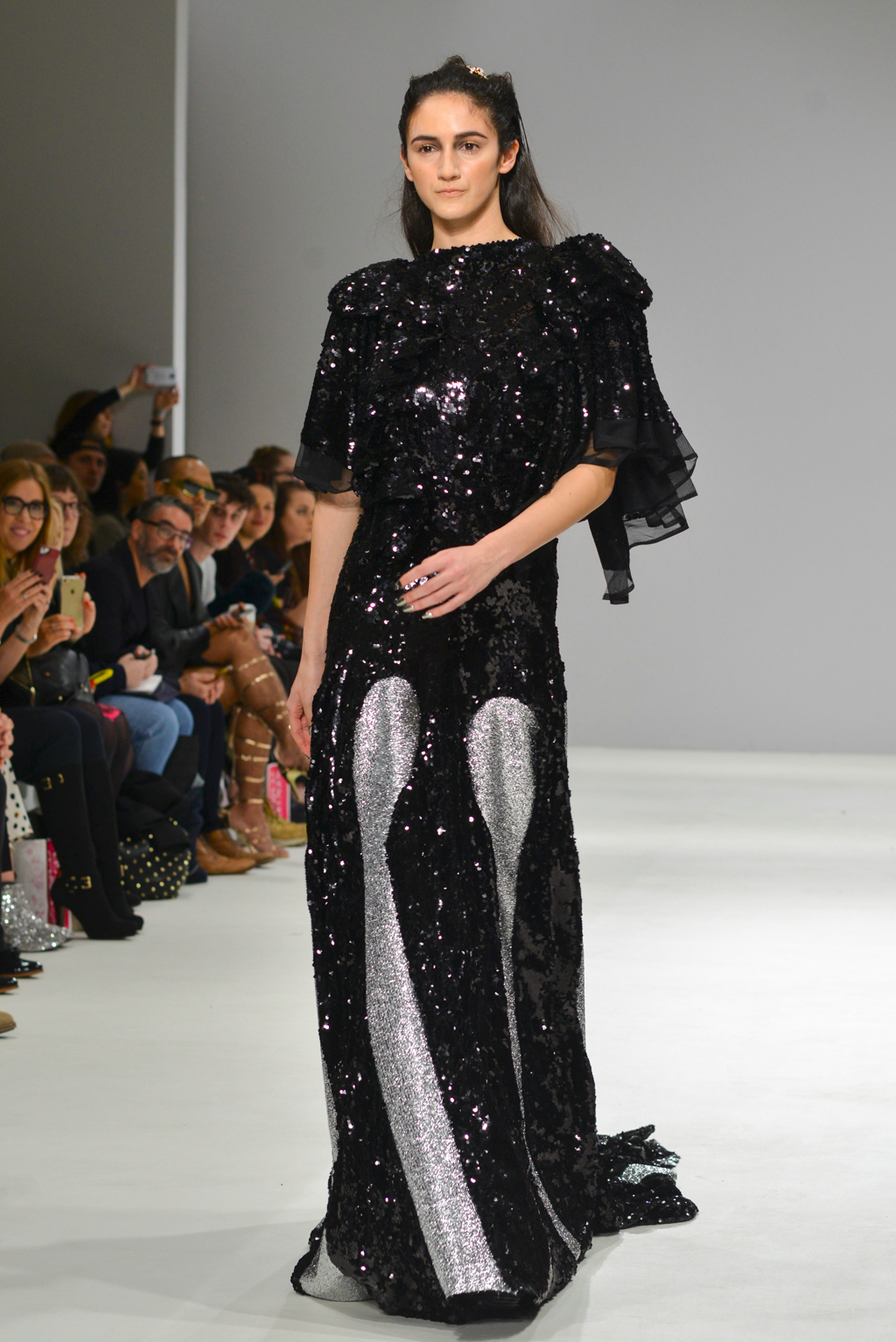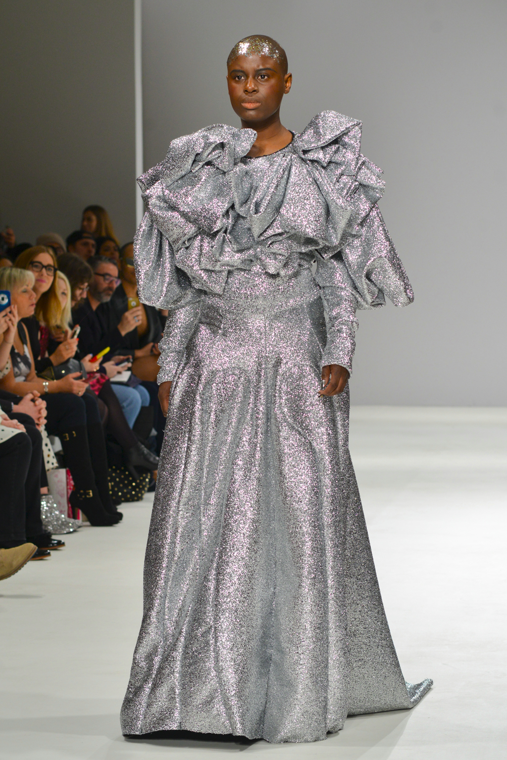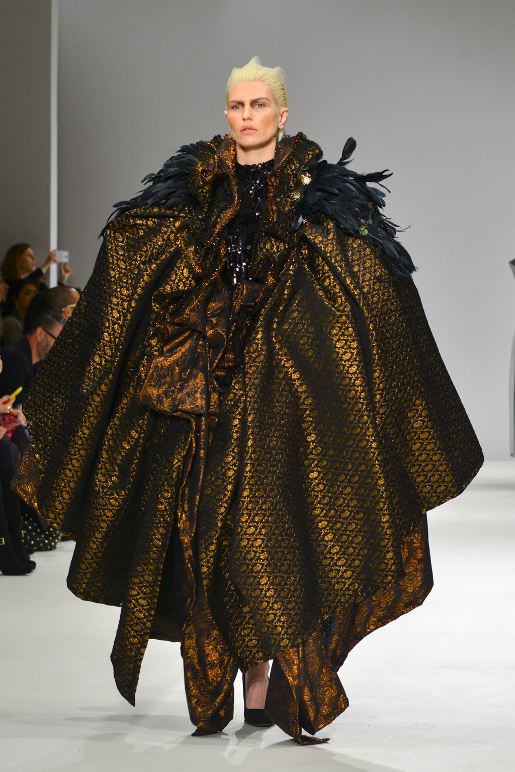 This changed to heavy rock music as the first model began to walk, dressed in a flowing gold glitter cape, with a flower garland for a collar and an impressive black paper flower on her head. The following look featured a black sequin bodysuit with a regal, gold cape across the shoulders. The running theme throughout the collection appeared to be a strong silhouette, reminiscent of Renaissance fashion, with voluminous shapes, powerful shoulders and layering of material. This was juxtaposed with the choice of colours or fabrics, with most of the outfits in metallic silver, gold or bronze with glittering sequins in abundance, creating a modern twist to these historically majestic colours.