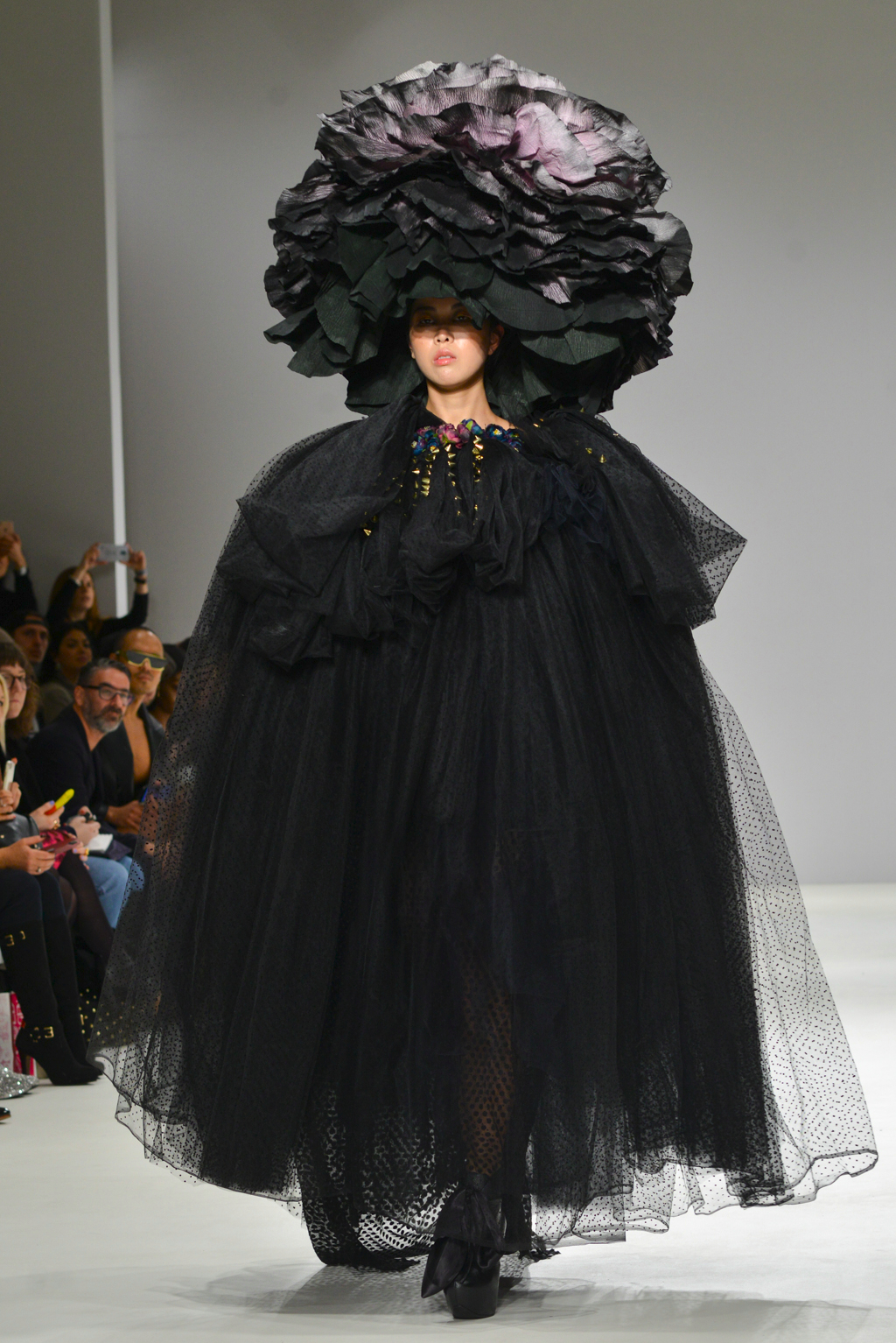 The focal point of the collection were the magnificent paper flowers that decorated a few of the looks. The best was certainly saved until last, as the model appeared wearing an elegant, floor-length dress and surrounding her upper half were enormous black paper flowers.