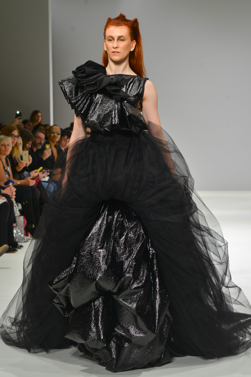From some angles they completely obscured the model from view, giving the appearance of a giant, gothic bouquet. The texture of the tissue-paper succeeded in creating depth and dimension to the shapes, with intricate layering that gave the flowers a realistic appearance. The material had life and movement as the model walked down the runway, which overall made the look captivating and powerful.
