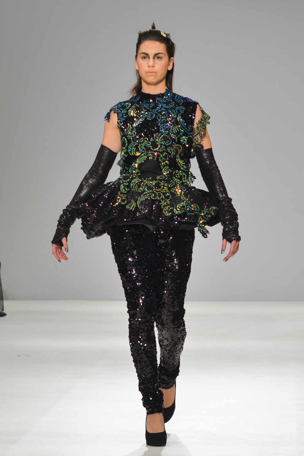 The whole collection was a playful juxtaposition of different shapes and fabrics, that clashed and combined to elevate the looks beyond traditional fashion. By utilising the silhouettes of historical Renaissance fashion with futuristic, glittering fabrics, Hellavagirl combines fashion of the past and of the future.