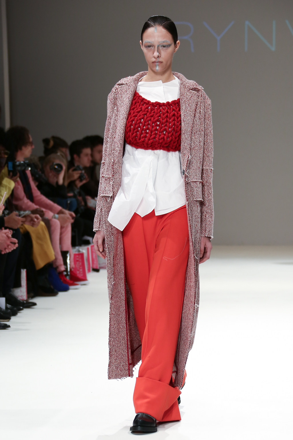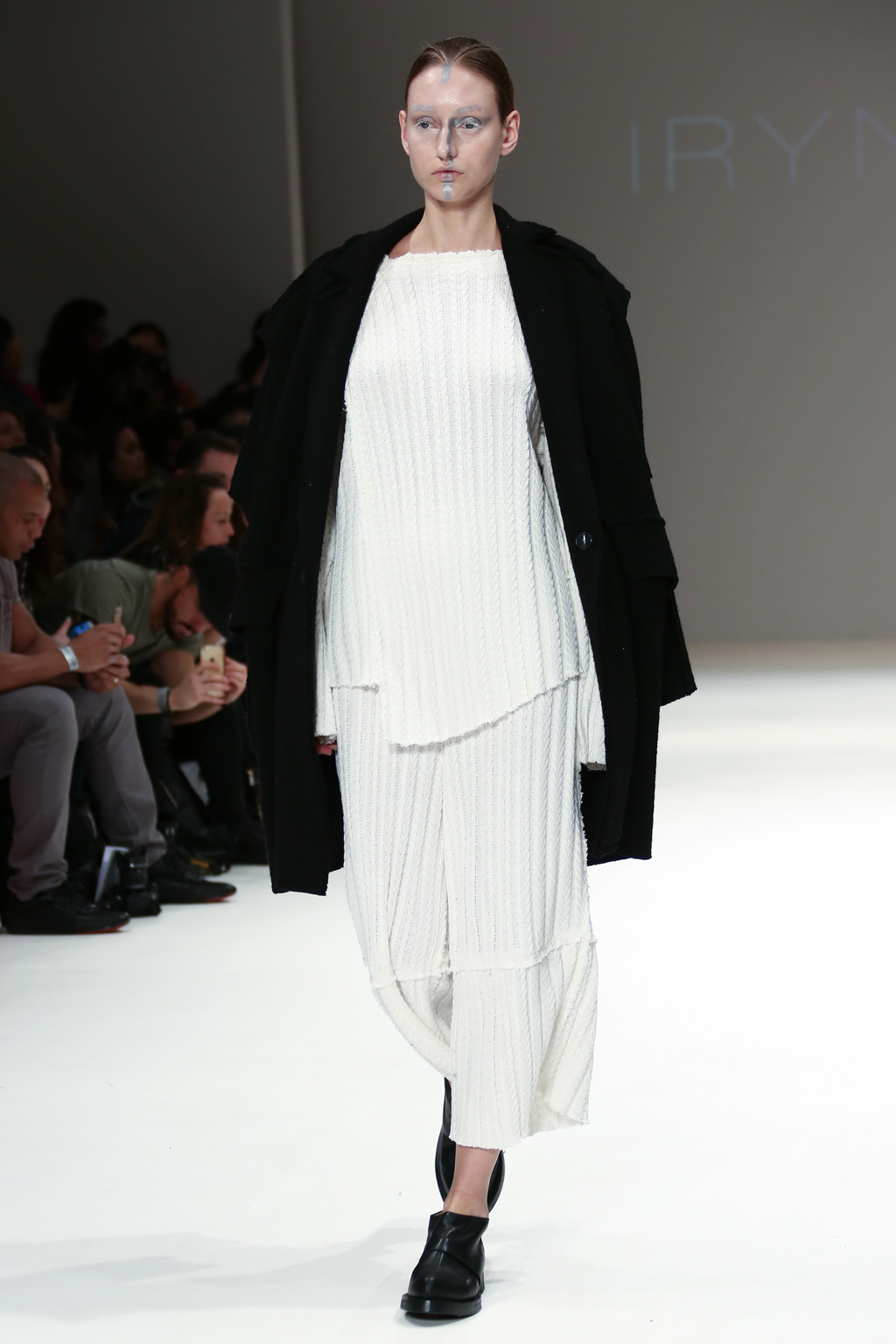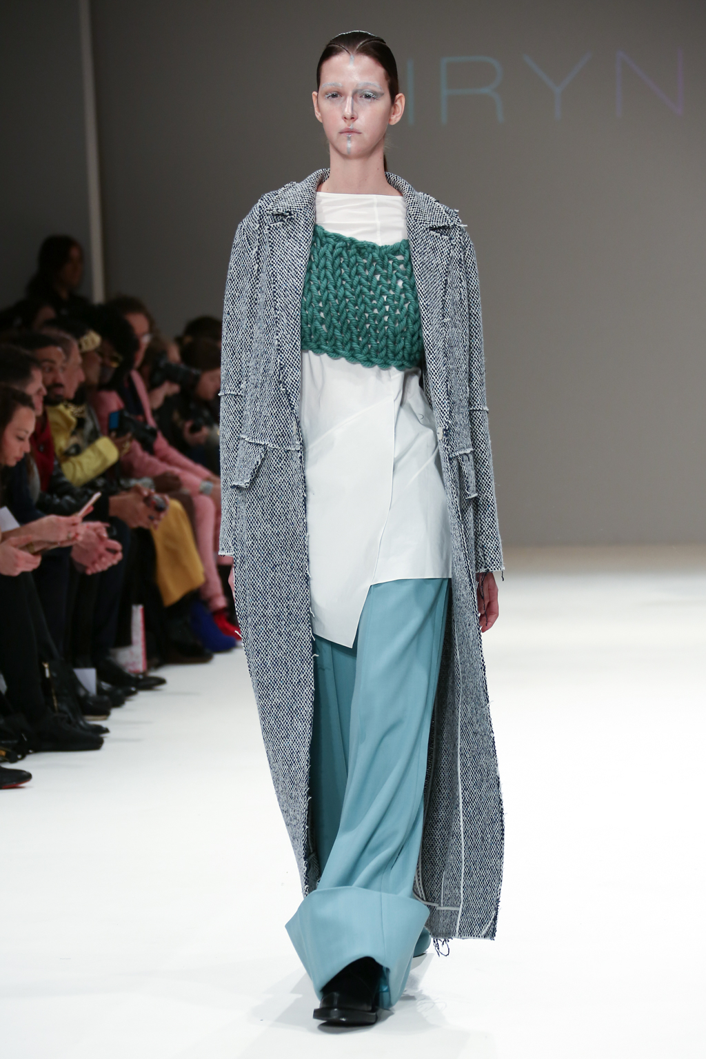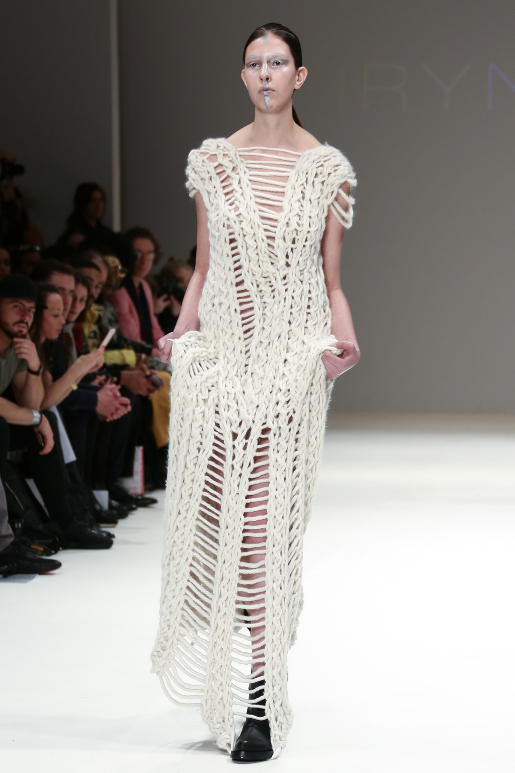 There were knitted textures throughout the collection; a large, chunky, holey knit in cream was formed to compose a long-line shift dress, further enhancing the pure, unaltered and sometimes even wild nature of Irynvigre’s conceptual designs.