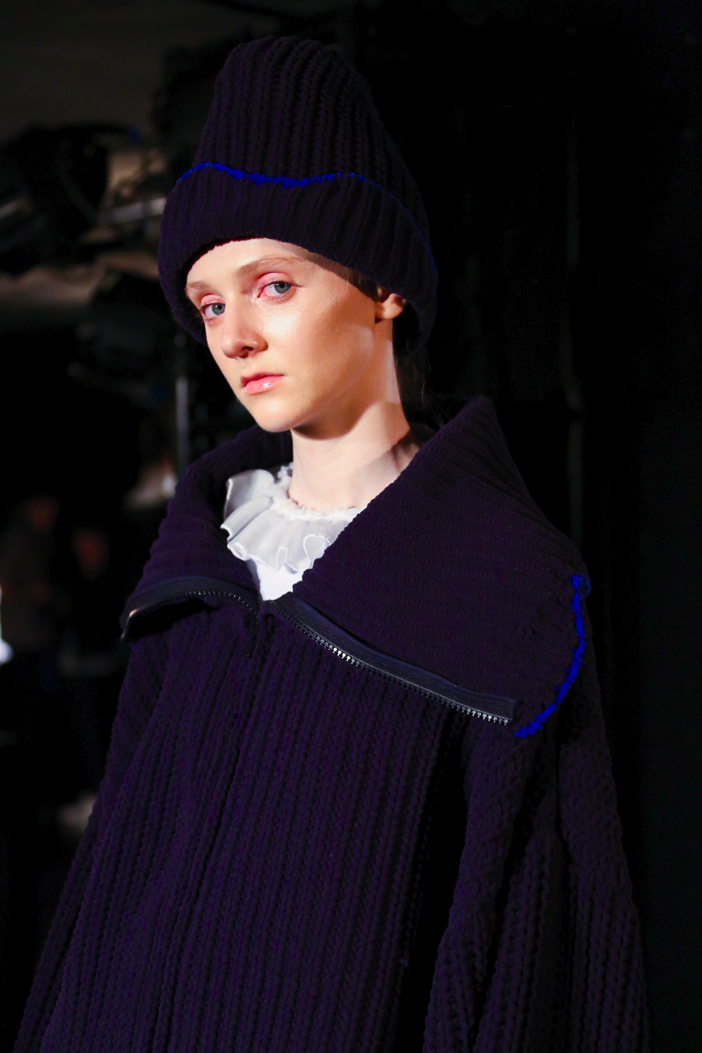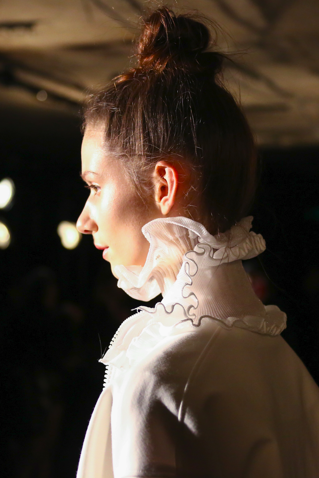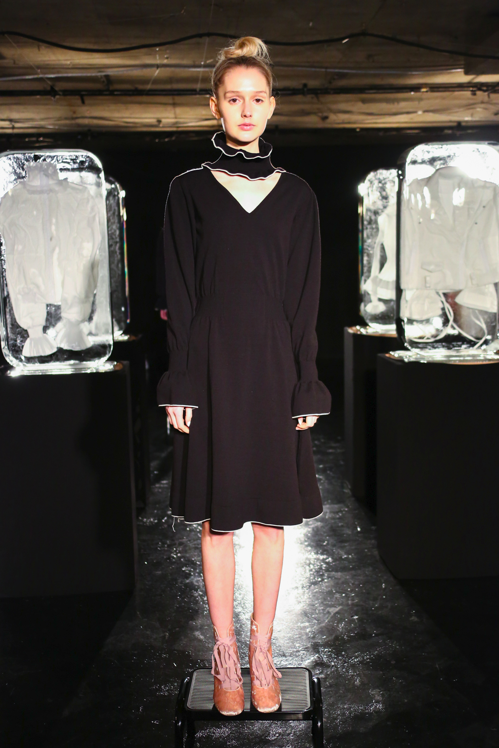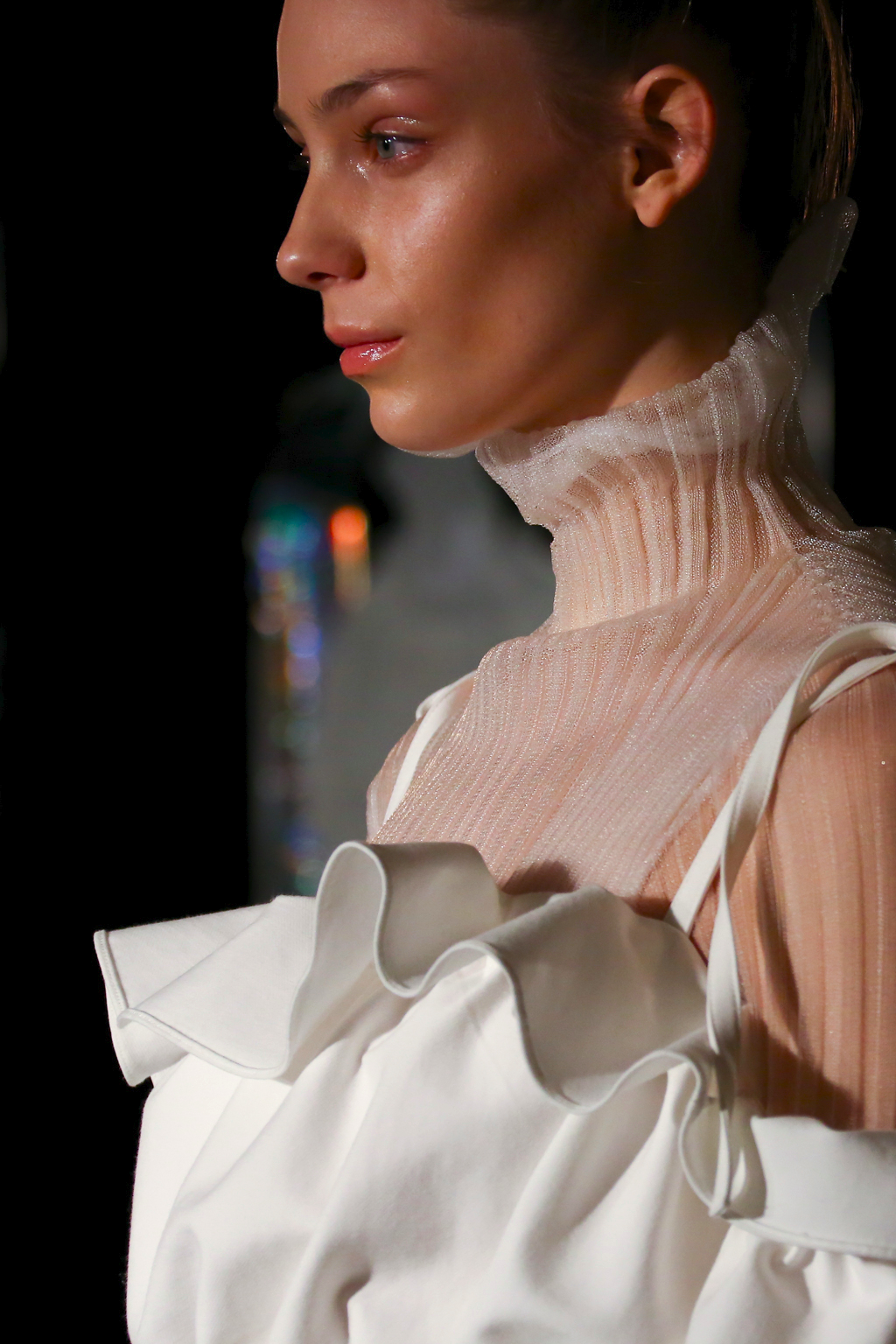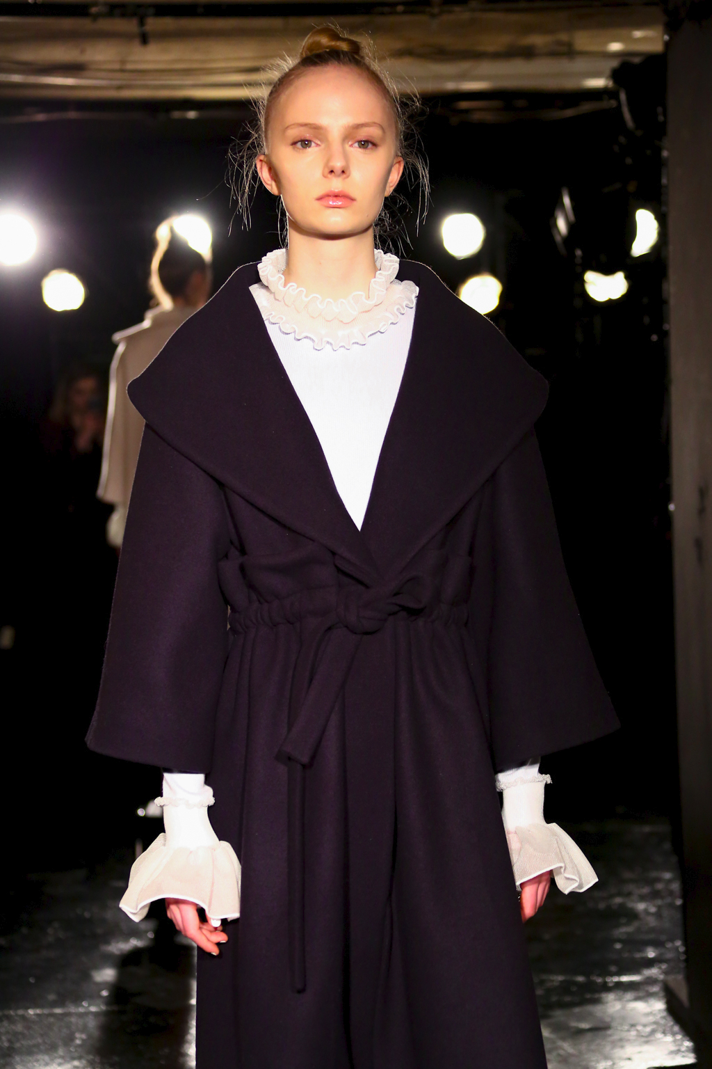 In a pitch-black room, the only visible things were the garments of an extraterrestrial appearance set in ice, lightened with ultramarine blue shades. This futuristic setting enhanced the designer’s vision. Known for her colourful and voluminous collections, Xiao Li amazed the audience once again through her presentation, using techniques of modern layering but with a classic twist, offered by organza Victorian neck ruffles (detail which was spotted throughout 2017 autumn/winter LFW) or by the Victorian-inspired salmon ankle boots.