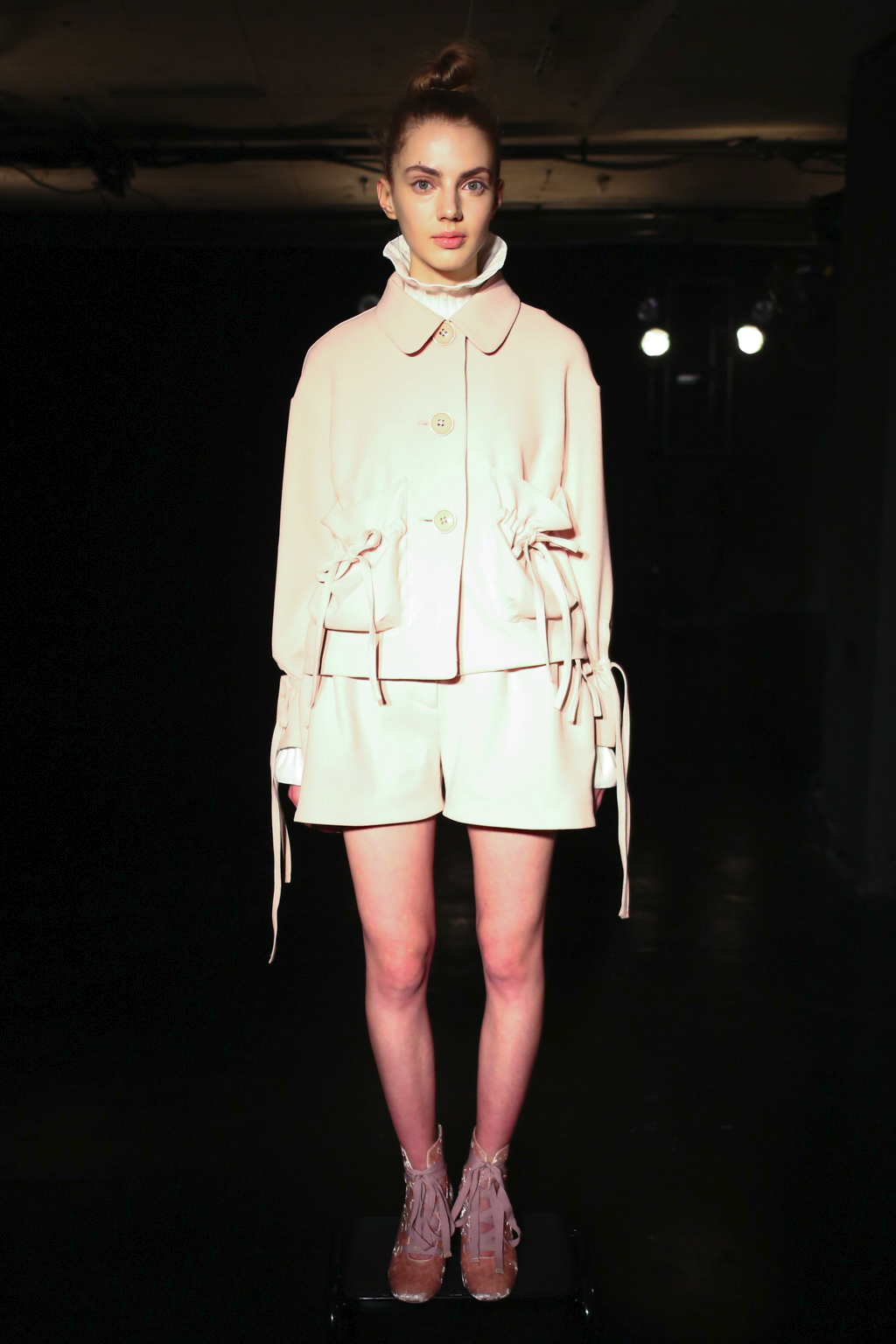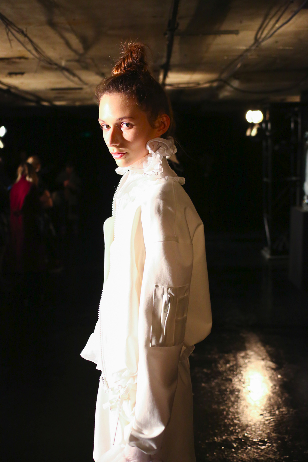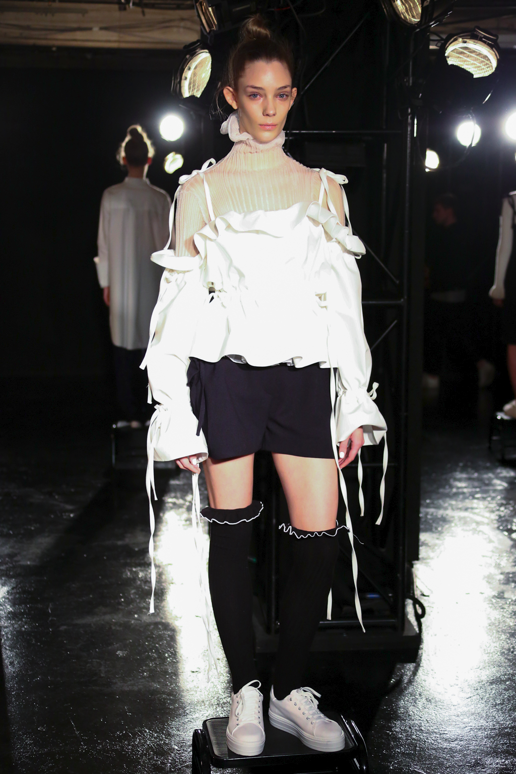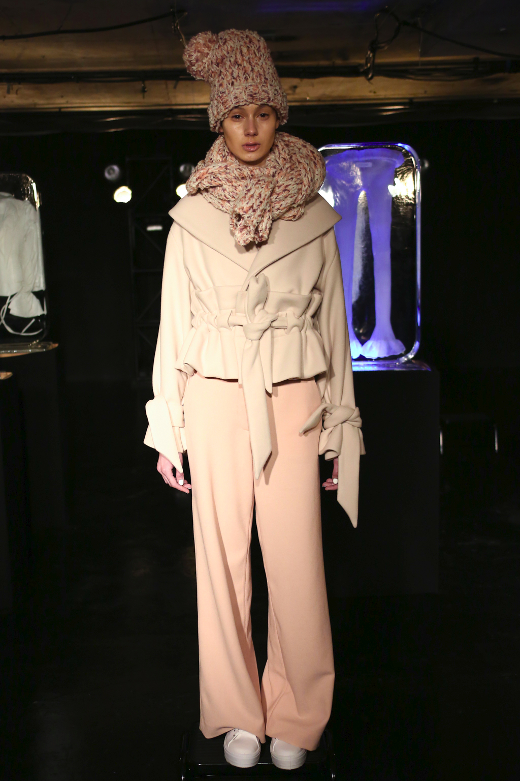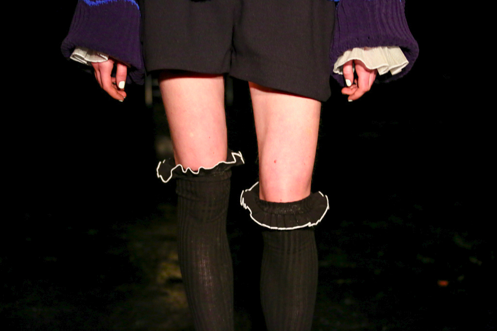 In a pitch-black room, the only visible things were the garments of an extraterrestrial appearance set in ice, lightened with ultramarine blue shades. This futuristic setting enhanced the designer’s vision. Known for her colourful and voluminous collections, Xiao Li amazed the audience once again through her presentation, using techniques of modern layering but with a classic twist, offered by organza Victorian neck ruffles (detail which was spotted throughout 2017 autumn/winter LFW) or by the Victorian-inspired salmon ankle boots.