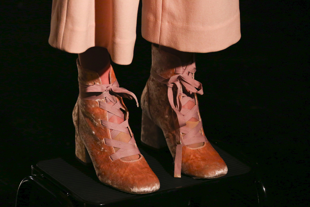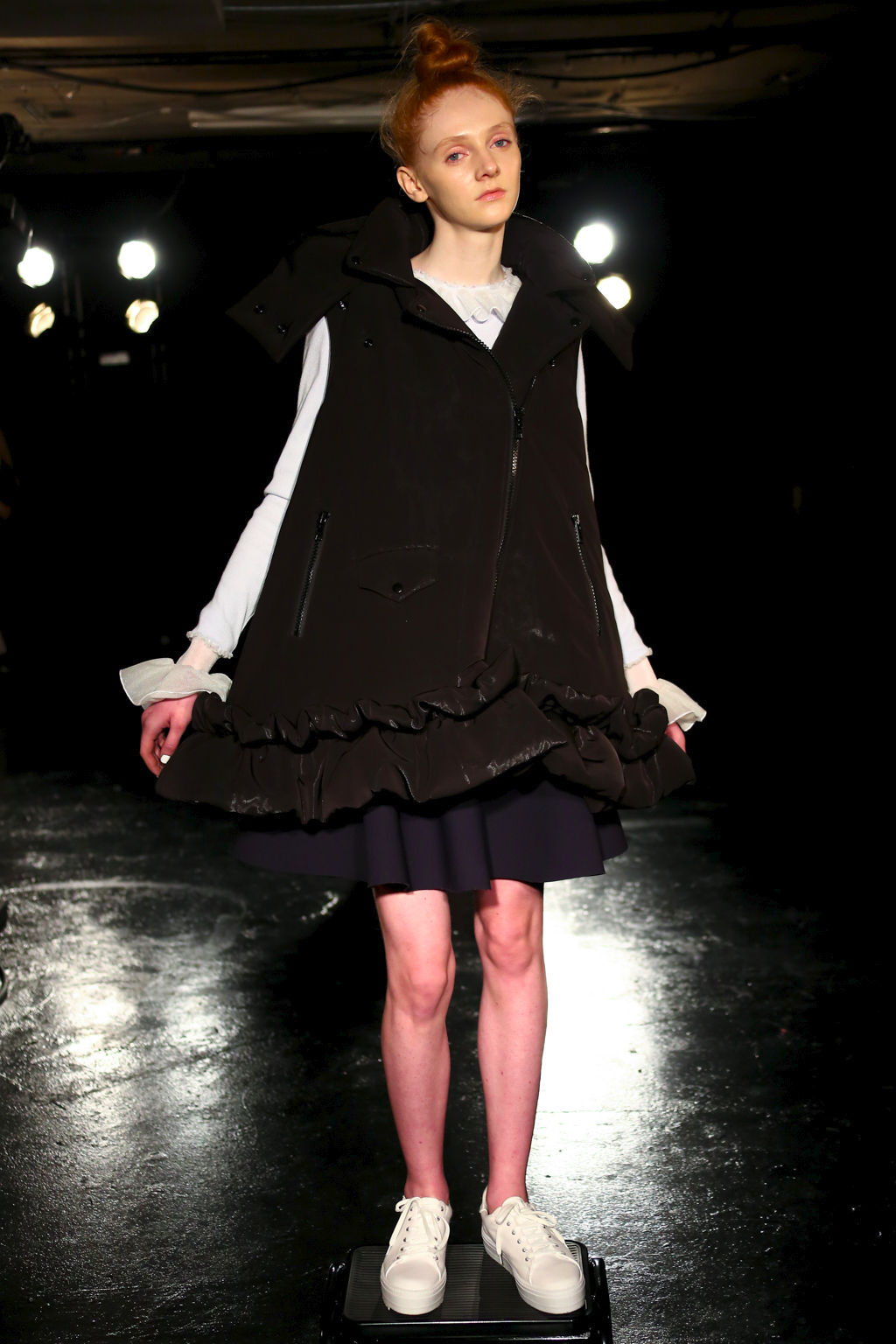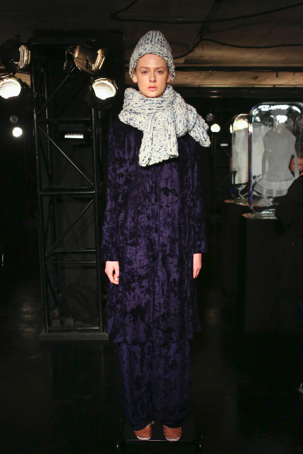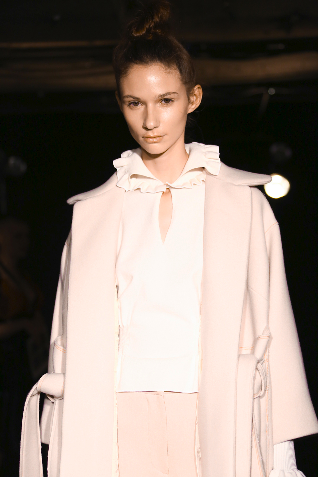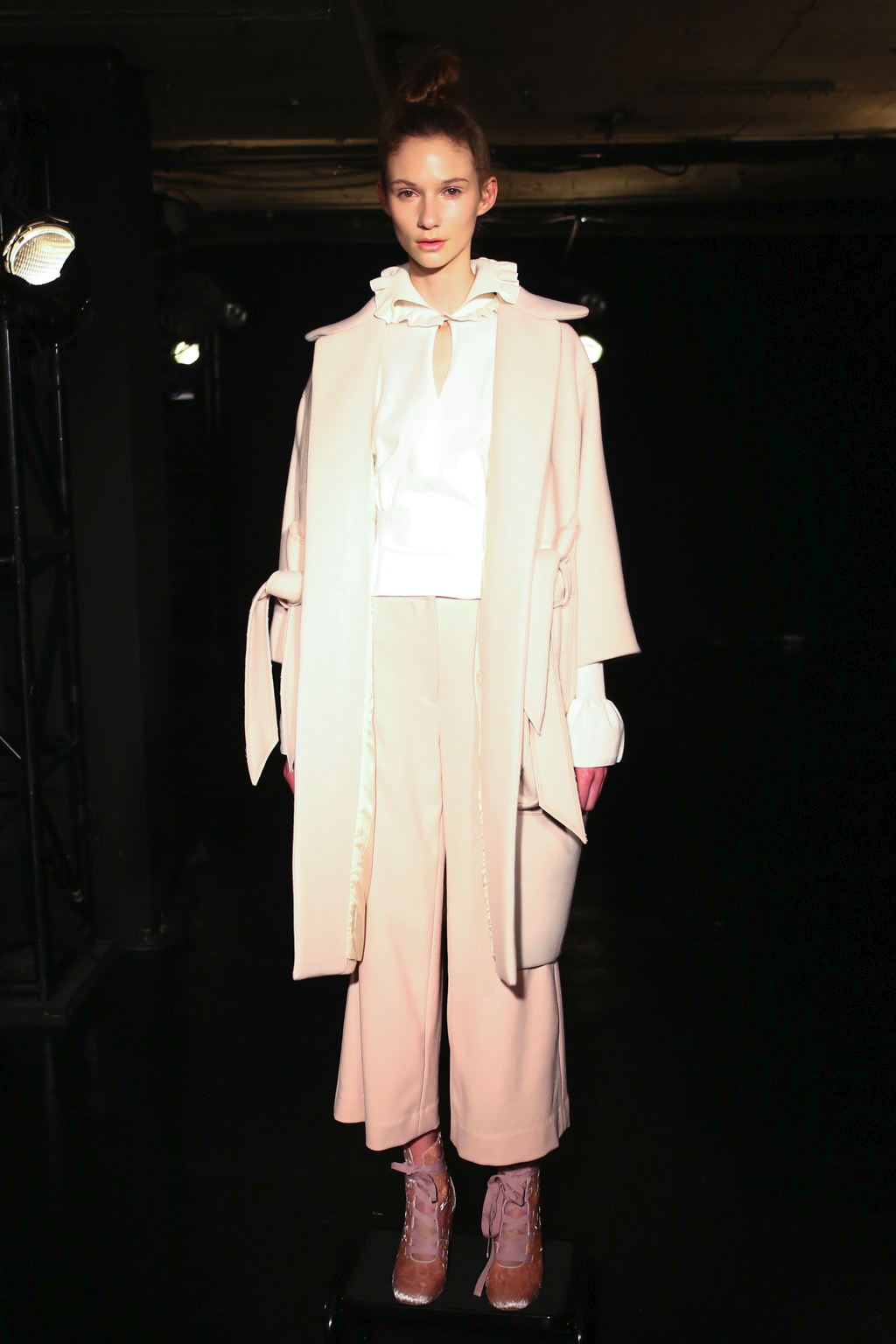 In a pitch-black room, the only visible things were the garments of an extraterrestrial appearance set in ice, lightened with ultramarine blue shades. This futuristic setting enhanced the designer’s vision. Known for her colourful and voluminous collections, Xiao Li amazed the audience once again through her presentation, using techniques of modern layering but with a classic twist, offered by organza Victorian neck ruffles (detail which was spotted throughout 2017 autumn/winter LFW) or by the Victorian-inspired salmon ankle boots.