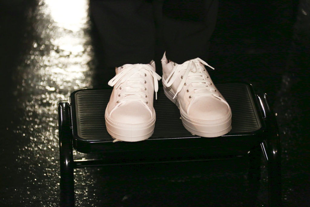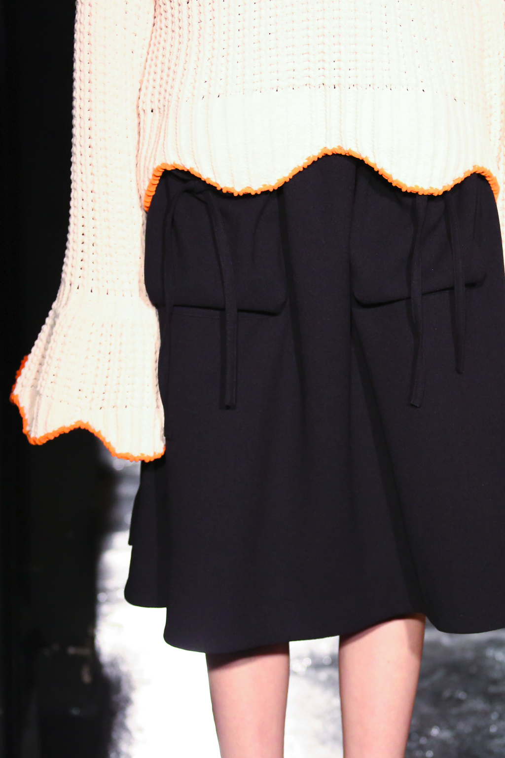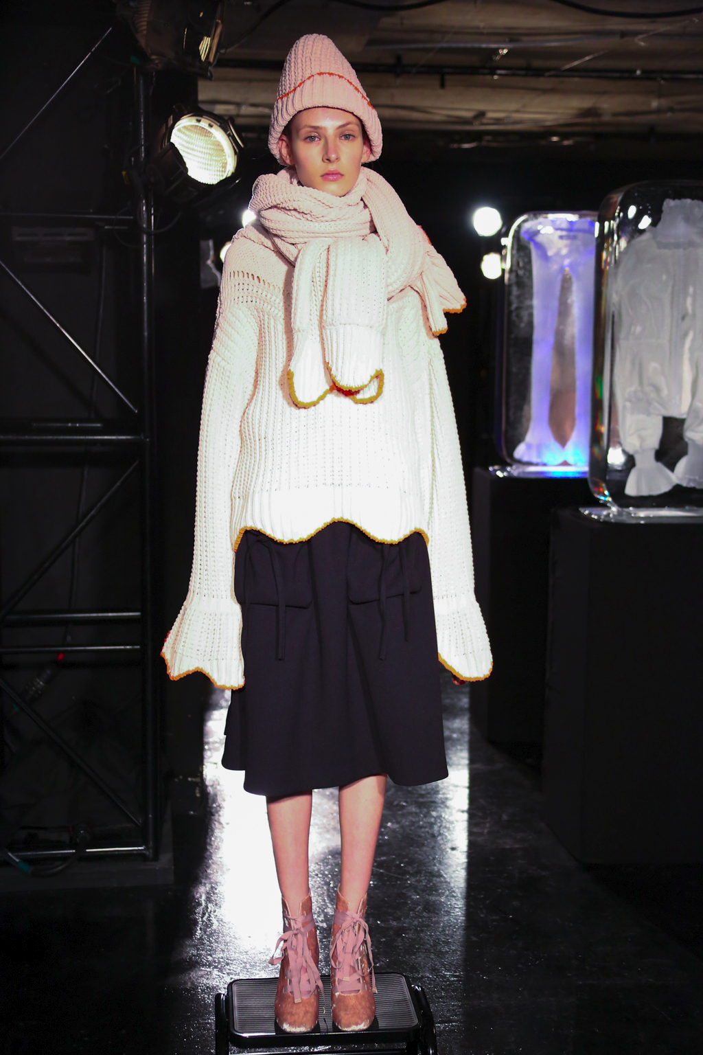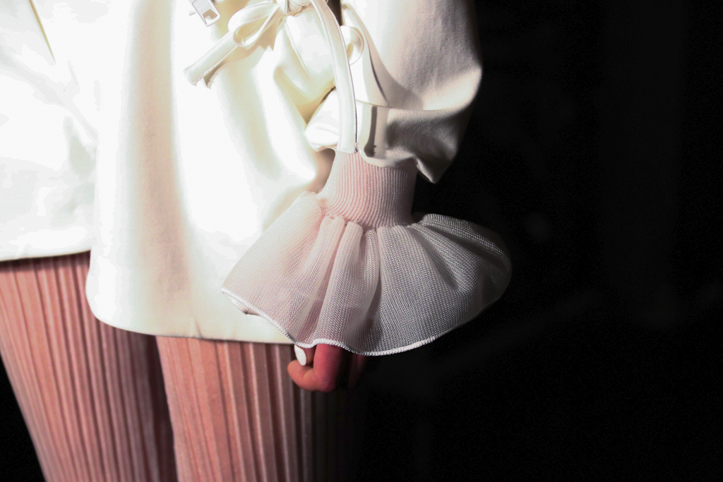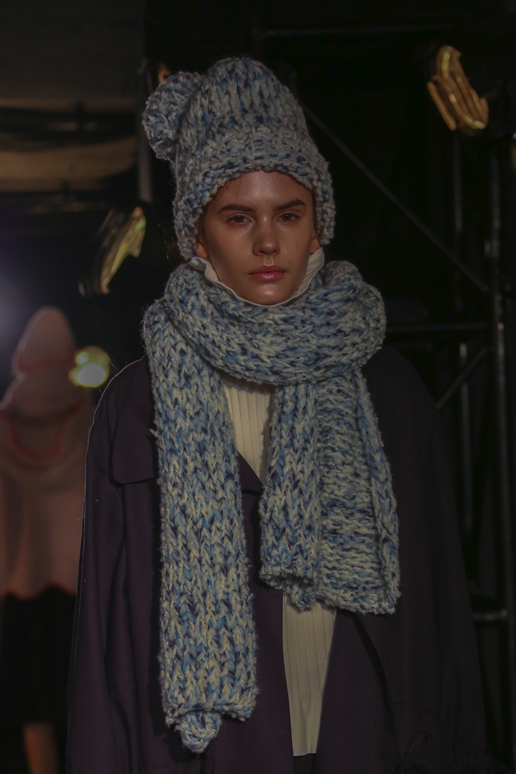 The piece which stood out from pale shades of blue, virescent green or rosés, was a vivid citrus orange, oversized knitted blouse with undulate cuts, worn with exaggerated wide leg black trousers. Meanwhile, the rest of the soft, feminine tones were contradicted by the thick, charcoal layers accessorised with oversized, pearly-grey knitted scarfs and hats. As predominant footwear, Li chose plain, white sneakers, suitable for the busy, everyday woman.