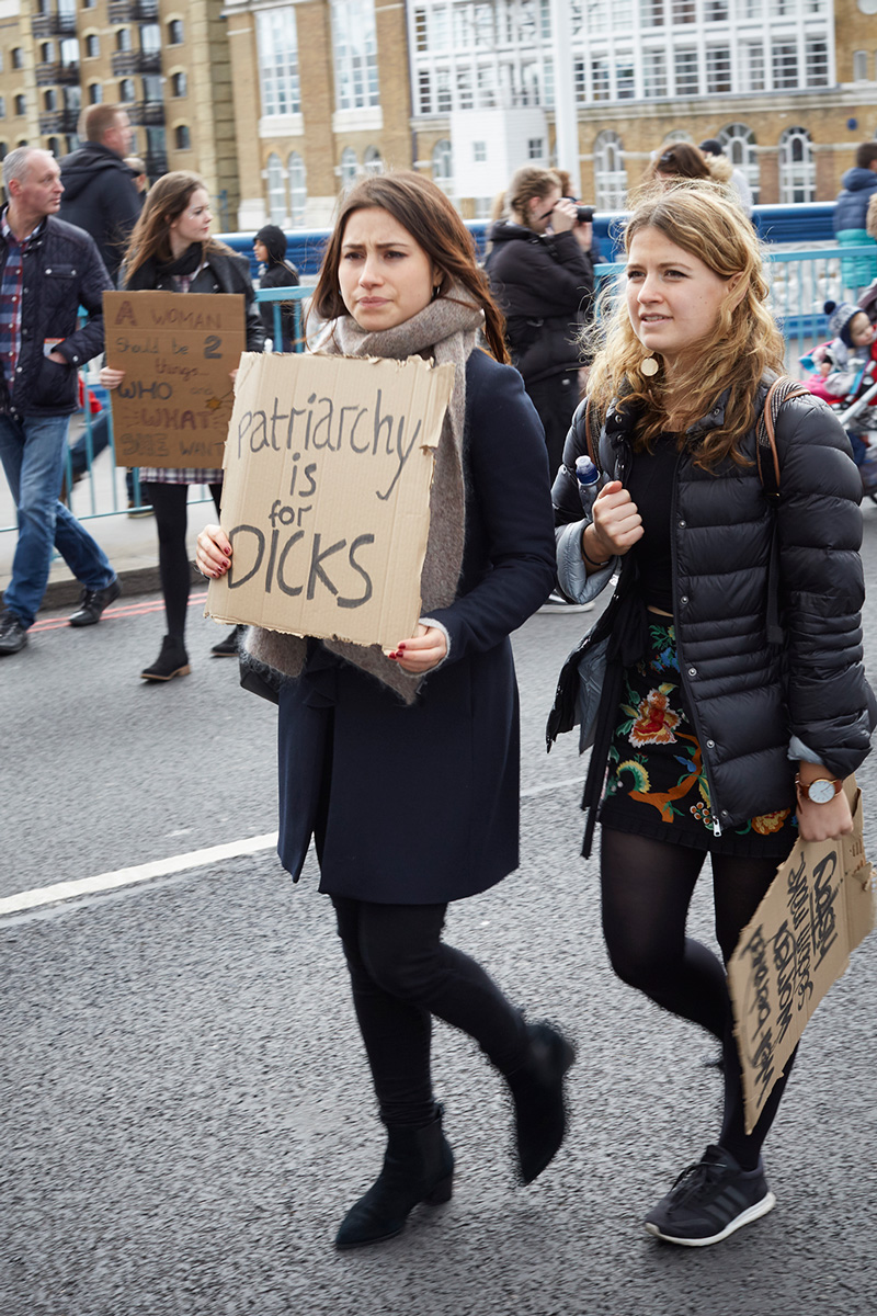 Through intermittent downpours, men and women of all ages then marched with the stars and modern-day suffragettes across the bridge. Many chanting, “nonetheless, she persisted” and brandishing placards, not only with the Care International tag line but the brilliantly humorous phrases Trump first inspired at the Women’s March on the day of his inauguration. Indeed, the sentiment seems to be, as expressed by Annie Lennox, that if Trump has done nothing for us, with comments like his locker room banter (“grab -em by the pussy”), he’s given the women’s rights movement something to rally against: “in a funny way, the Donald Trump statement is almost helpful as a catalyst”.