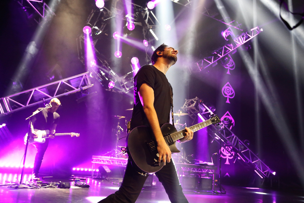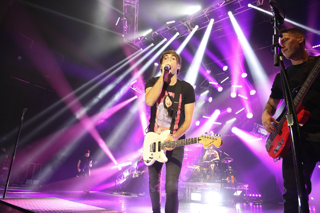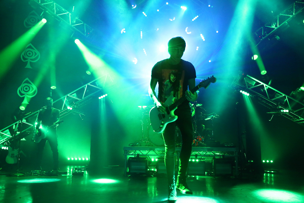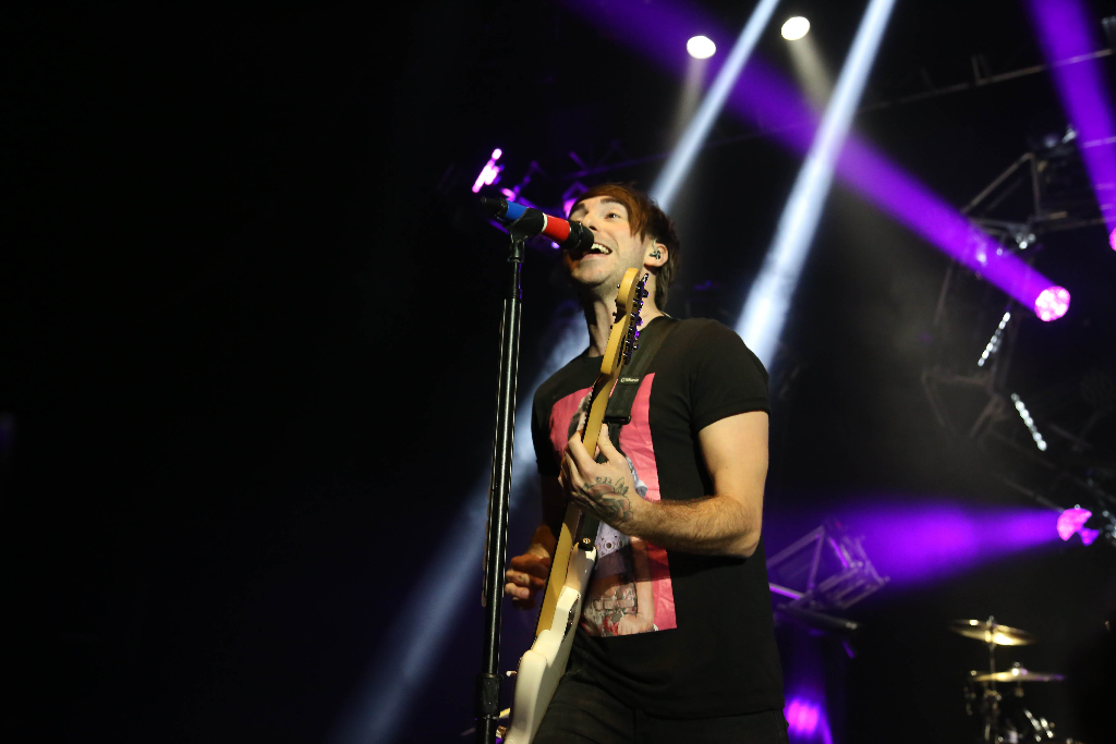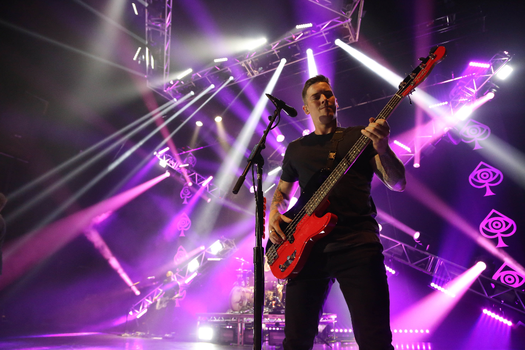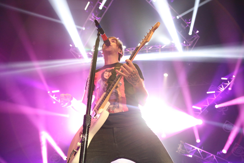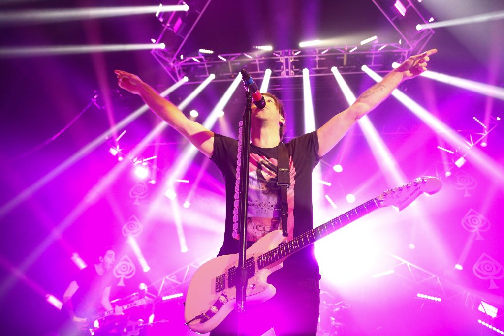 To screams and pink lights, a dramatic, very cool, and immediately high-octane concert exploded at Eventim Apollo as All Time Low opened with their super energetic quintessential punk rock Kicking and Screaming – accompanied by an ebullient multi-coloured strobe extravaganza. With an enormous sea of people jumping, arms flailing, and singing along, the huge auditorium was literally shaking. With lead singer Alex Gaskarth, lead guitarist Jack Barakat, bassist Zack Merrick and drummer Rian Dawson, the band was on top form and clearly enjoying themselves.