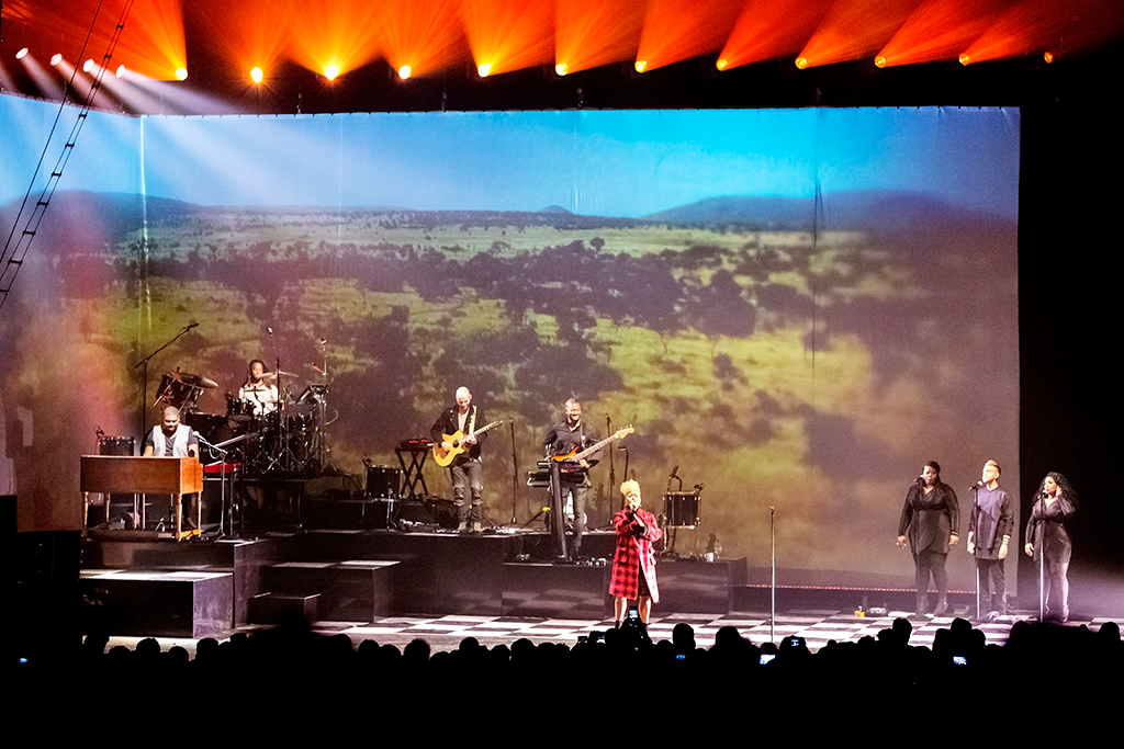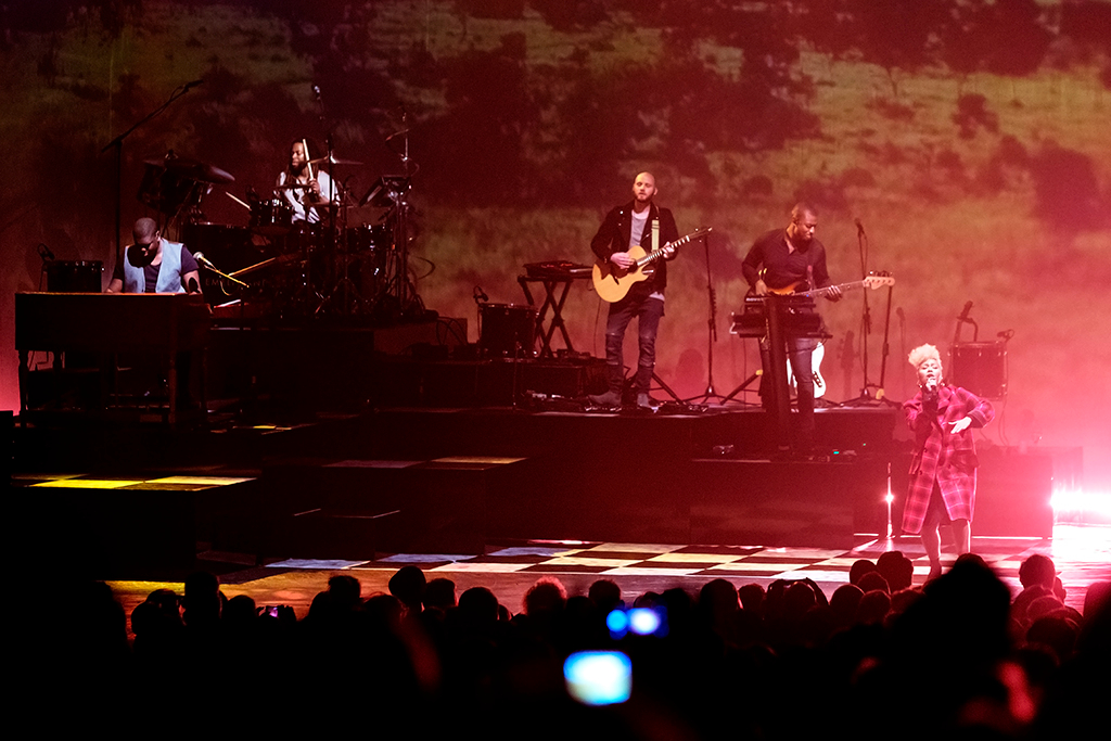 This concert was always going to be a delicious mix of both albums, with something for everyone: Tender, with all its glorious Zambian influences, an intimate duet of Beneath Your Beautiful, a joyful foot-stomping rendition of Wonder. Whether accompanied by the band and gospel harmonies or just one guitar, or playing the piano herself, the singer sang each number with feeling and impressive range. The set list jumped smoothly from a stripped-back rendition one minute to full band and drum solo the next. The best example of this was Hurts, paired with the projected graphics of a dizzying thunderstorm, launching into Breathing Underwater and the visuals of heaven-like clouds. This exemplified Sandé’s journey of tragedy to triumph, as she described Breathing Underwater as her hopeful “light at the end of the tunnel”.