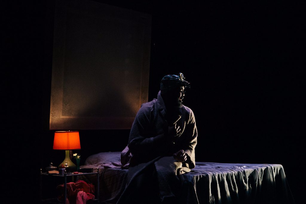 Behind the simple set (a bed, a bare light bulb, an overhanging picture frame) sits the Psappha ensemble, a full live orchestra. Their position at the very back, partially concealed by a curtain, dispenses with any pomp or ceremony and shifts the focus to the music.