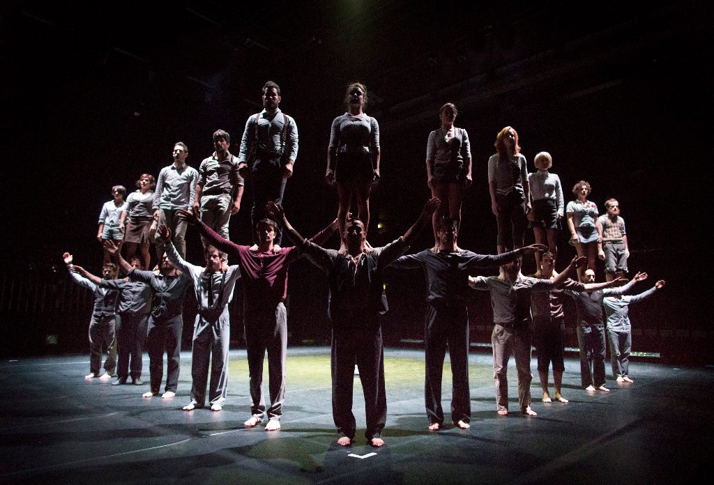 The entire performance is like a hominid kaleidoscope, graceful, athletic, artistic – and sometimes very witty and humorous, with enacting of quirky movements and sounds, clowning around, yet with all elements elegantly flowing with aesthetic precision within this kinetic theatrical sculpture. Using props like a seesaw and large square boards, the troupe seems equipped with hidden springs in their feet as they shoot up and over and around like personified fireworks, twirling in mid air, or forming a kind of layer cake with people upon boards upon boards.