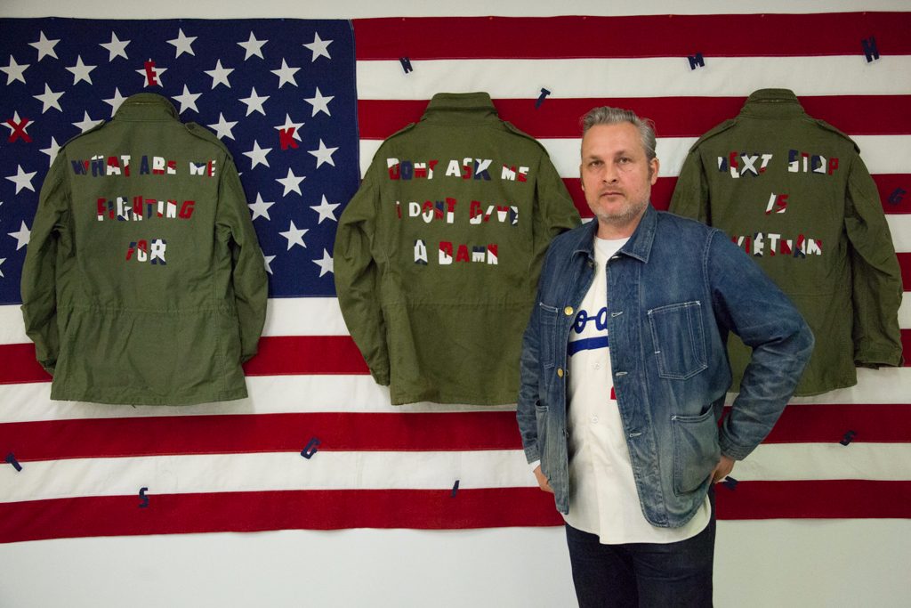 Here, however, he is triumphant, delivering a stunning and intelligent homage to young GIs, whose lives are often reduced to glorified stories of heroism, their humanity lost as we raise them on to a pedestal. The artist has made use of “all-American” artefacts from flags, comics and uniforms, and viewers are barraged with symbols of pride and power that we associate today with recruitment ads.