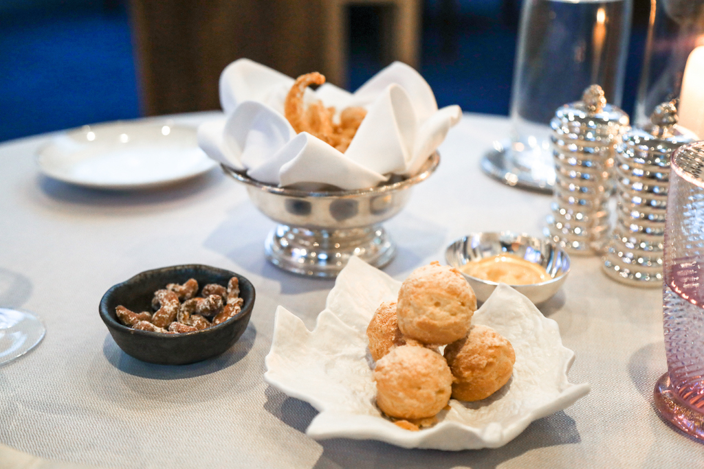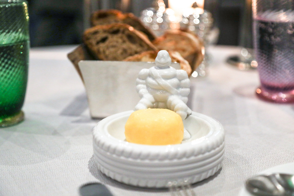 Whenever a skilled cook is involved, the Veal Sweetbread is something that should be tried; however, we were after creative dishes and we ordered the Wheat-free Spring Vegetable Dumpling too. Before our starters were served, we were treated with a series of amuse-bouches and, of course, bread and butter; the butter, which was an highlight itself, as it lay on a very cute tyre-shaped plate with a little bibendum man sitting on it. These appetisers were partly a taste of what Bosi did at Hibiscus – Parmesan gougères; foie gras ice cream; mushroom, coconut and curry powder en cocotte – and partly new – the molecular-era spherical olives served below the branches of a tiny olive tree and the fried chicken skin together with a chicken mayo.