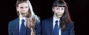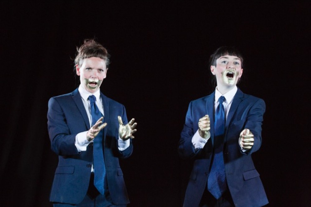 The play is a literal and physical deconstruction of British politics. This show consists of three female performers; Nic Green, Rosana Cade and Laura Bradshaw all command the stage with ease and can drastically change the mood of the room in seconds. When we first see them they are identically dressed in neat blue suits complete with gold hands and gold facial hair, but as our deconstruction goes on they literally strip down to reveal the truth underneath.