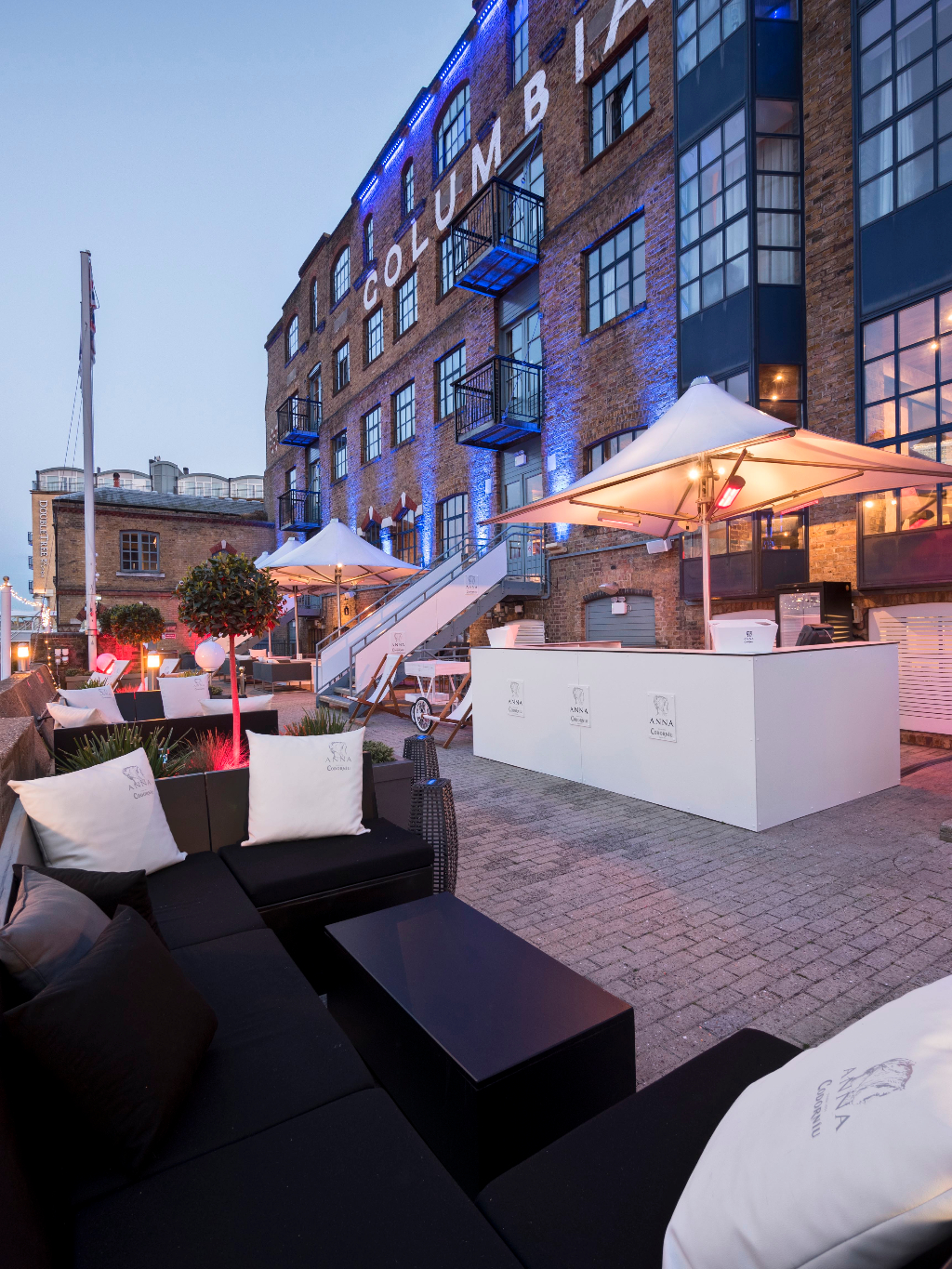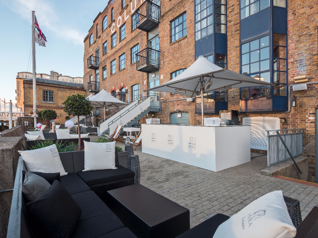 The former dock warehouse is complemented by an understated colour palette of greys, whites and muted golds, with the charismatic Anna brand fusing old and new. Complete with white parasols, grey seating and a gleaming bar, the striking design is softened by green foliage, twinkling lights and smartly dressed staff, creating a fresh summery feel that it’s impossible not to feel relaxed in. White blankets and cushions are a personal touch, and keep the cooler evening air at bay as the sun sets over the London skyline. Live music and a DJ enhance an already beautifully curated experience, with Spanish music gently nudging us back to Anna’s roots.
