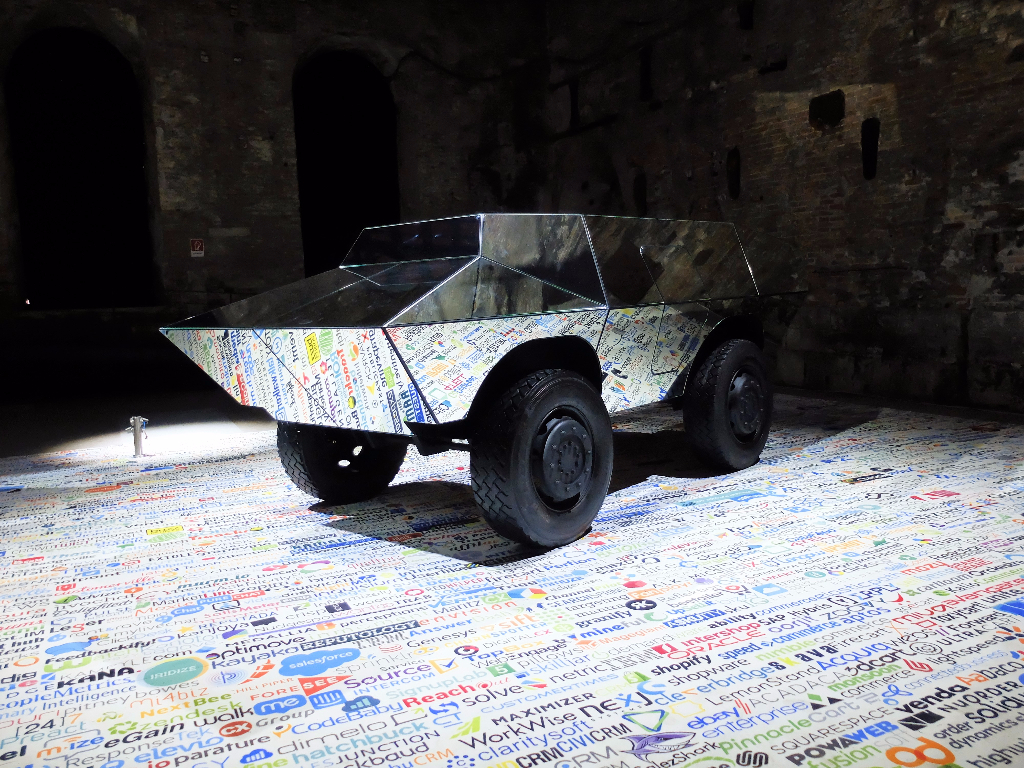 Last but not least, the Hyperpavilion is located on the opposite side of the Arsenale, accessible only by boat. It’s not a national pavilion like the others on this list, but it’s worth mentioning as one of the largest spaces in the Biennale in 2017. Picking up on some of the biggest intellectual trends of the last year, the Hyperpavilion examines the merging of life offline and online, networked culture and hyperconnectivity. Work by 11 artists is on show, including video pieces, immersive digital experiences, installation and performance. Theo Massoulier offers a series of strange hybrid objects, all part-organic, part-technological, that look like futuristic sea creatures, attractive and repellent in equal measure. Also particularly effective are an installation and performance from Aram Bartholl consisting of a mirrored tank situated on a large sheet of brand logos and a pair of security guards who ask visitors to hand over their phones so they can check their Facebook profiles. The dim lighting adds to the sense of paranoia that the visitor is being viewed as well as doing the viewing, drawing attention to the growing global culture of surveillance.