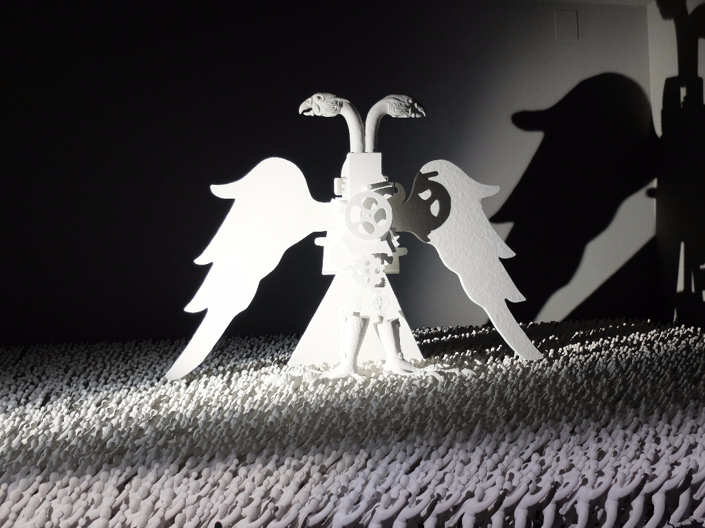 The title of the Latvian pavilion – What Can Go Wrong – can be interpreted in a number of ways: as a reckless or carefree question or a statement of risk. Miķelis Fišers is drawn towards bodies of knowledge that are seen as unsubstantiated or without status; that which is esoteric or conspiratorial. Consequently, his visual language is one of monsters, aliens and futuristic technology. These things populate a series of cartoonish carvings, featuring titles such as “Aliens Force Musicians to Defecate in the Orchestra Pit at the Metropolitan Opera, NY” and “Modified Squids Loot the Potash Plant”. Unafraid to use humour, the installation points to the bizarre things human beings find to fear in the face of genuinely unsettling changes in our environment and government.