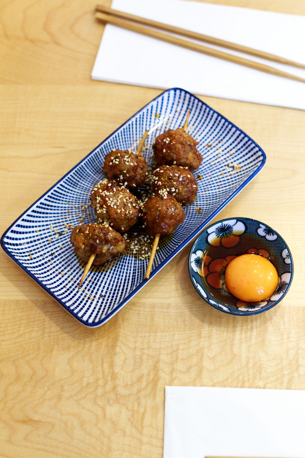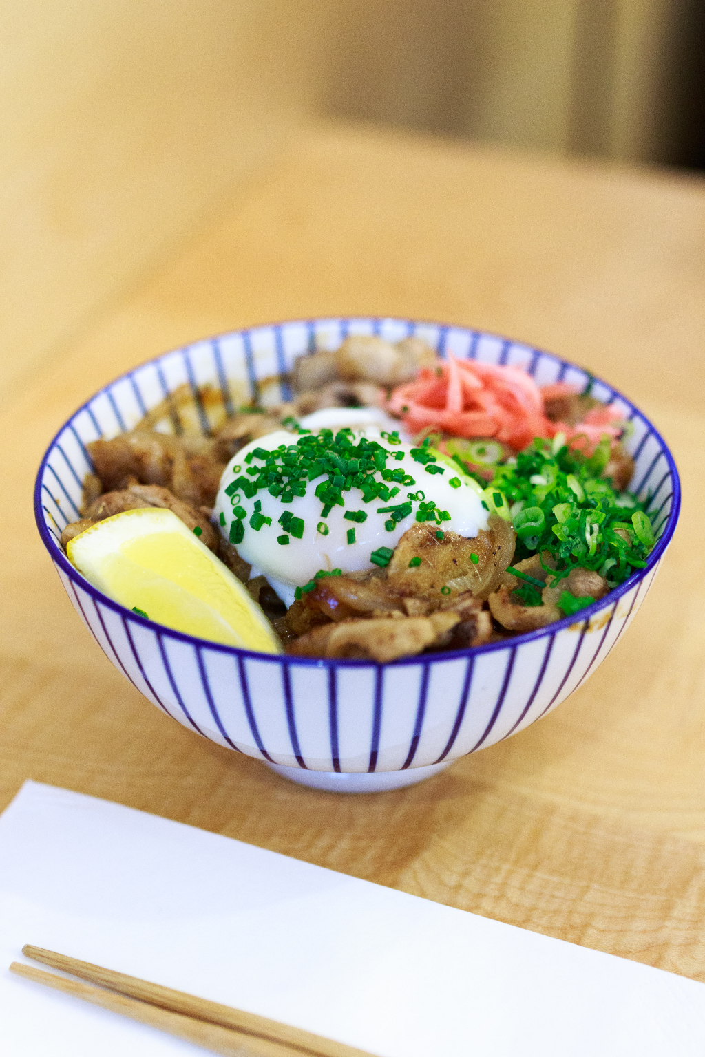 The tsukune – minced chicken skewers with sesame seeds and shichimi pepper – are deliciously sticky, sweet and not to be missed. Just don’t shy away from the burford brown egg yolk dip, you’ll thank us later. We opted for the buta shogayaki special, a generously sized donburi bowl topped with sauteed ginger pork, pickled ginger and a onsen lamago that, when prodded, spilled gloriously runny yolk over the ribbons of tender meat.