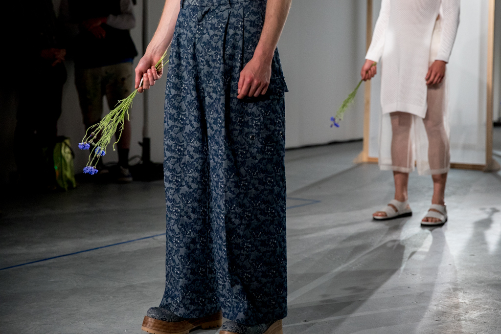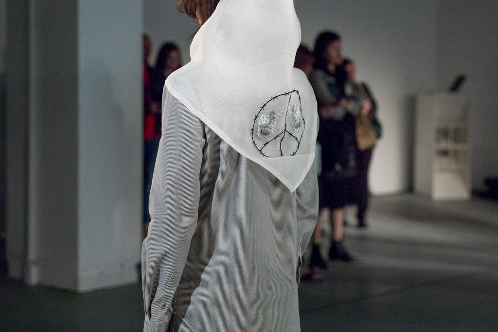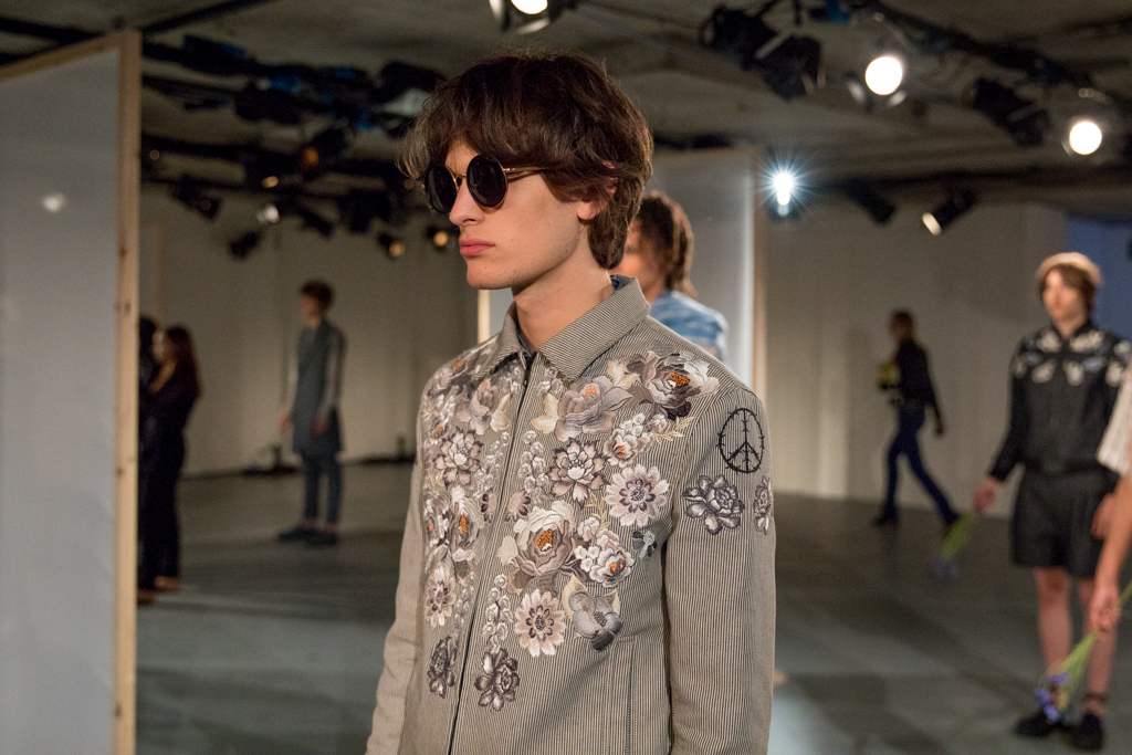 The self-declared “juxtaposition of machismo with femininity” consisted of sheer embroidered tunics and wide leg trousers contrasted with military pockets and over-dyed denim jackets. From afar, barbed wire embroideries hid as innocent pinstripes on wide leg trousers, and carefree peace symbols amongst daisies. Floral embroideries replaced rock and roll patches, and military boots were merged with platforms for a more practical fighting edge.
