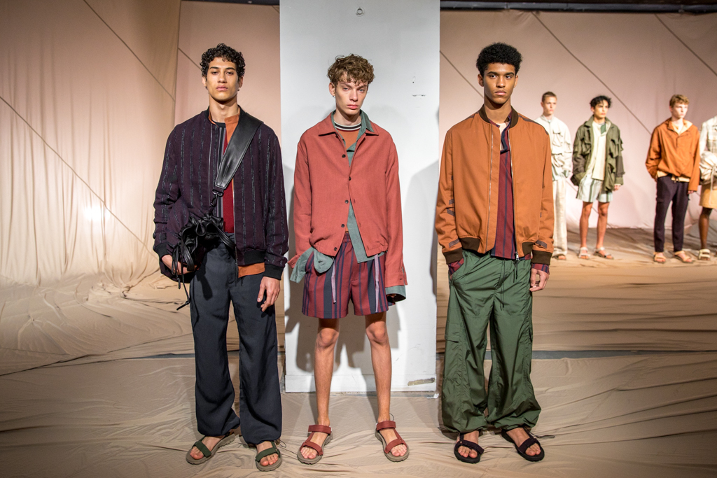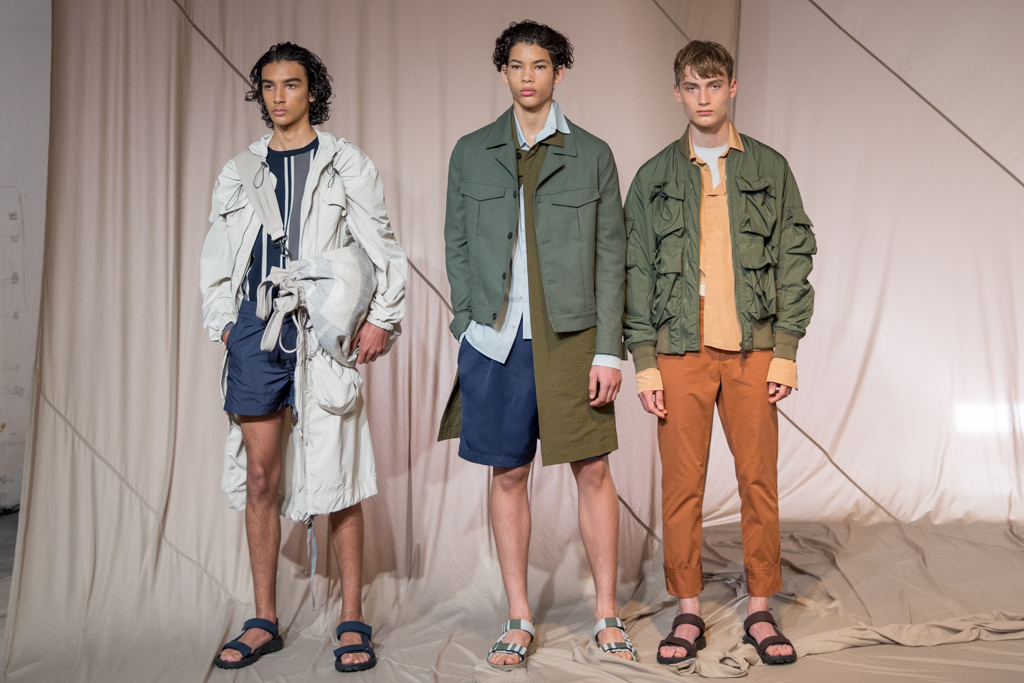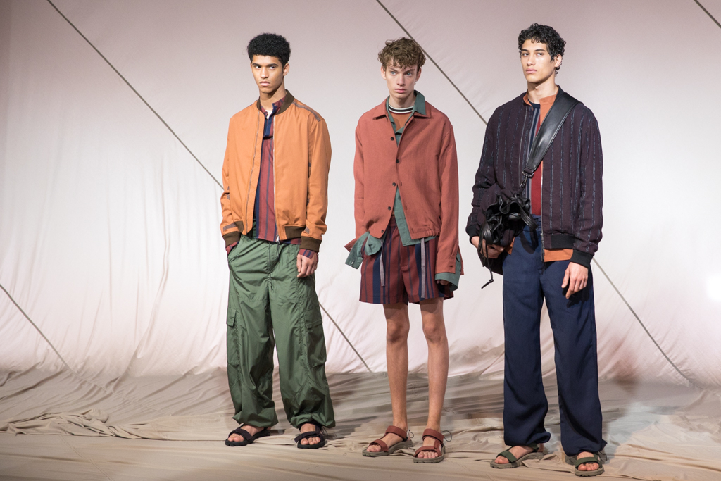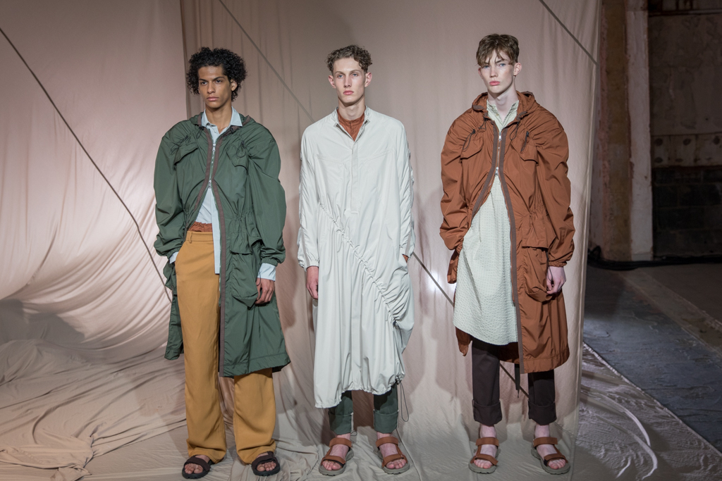 A desert army colour palette of sienna, thyme, khaki and granite is complimented by pale blue, mint stripe, rhubarb and pomegranate. Nylon cargo pants and cargo flares made for an interesting take on a dad-style military classic. These love them or hate them pieces were shown alongside ruched lightweight bombers and pull over jackets, creating billowing parachuter silhouettes.