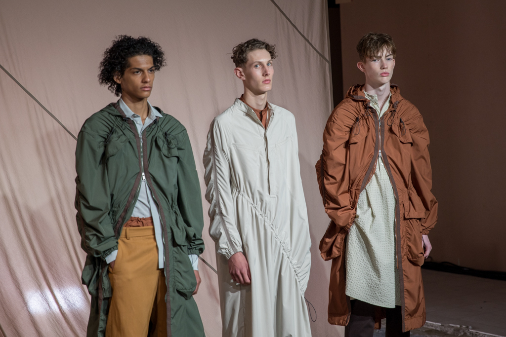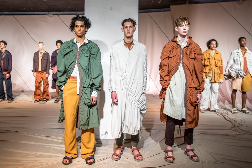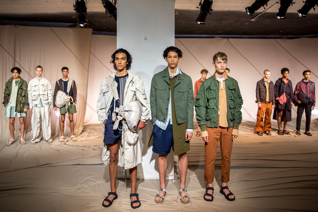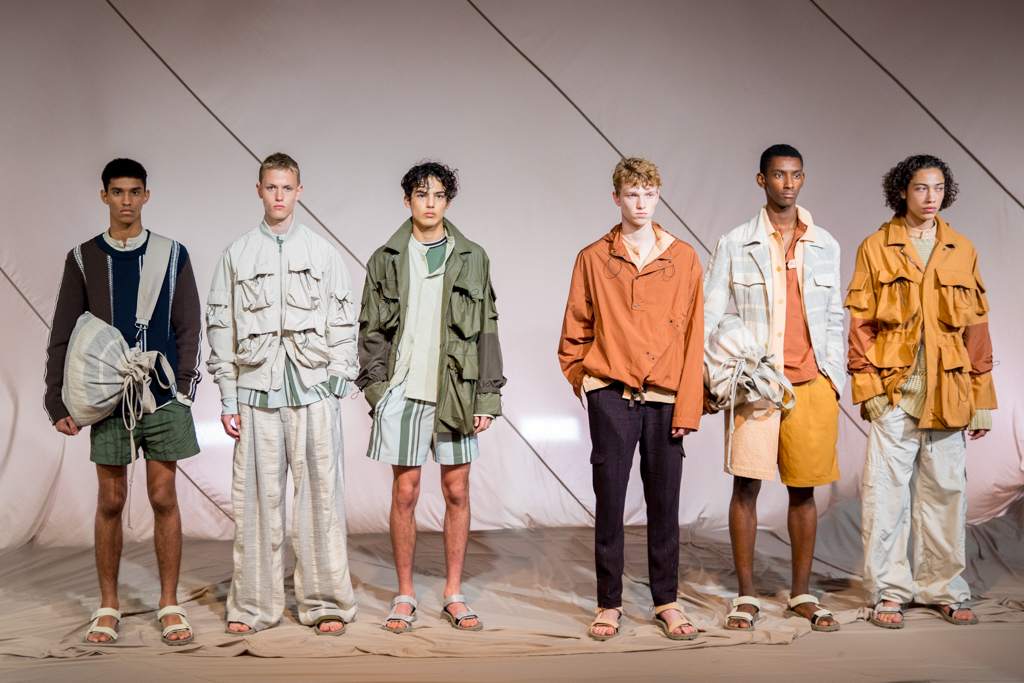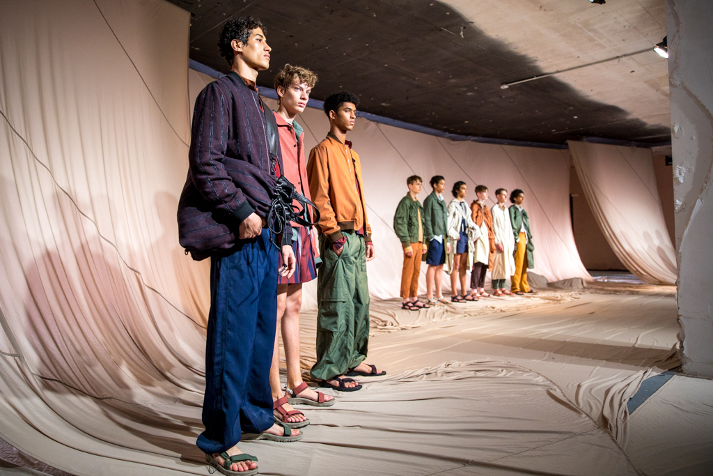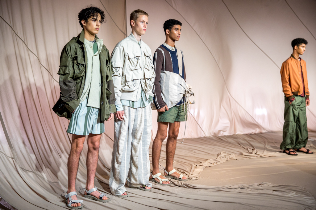 Set on a desert of nylon, Qasimi told press that the brand’s SS18 collection titled Free Fall is a “yearning for simpler times in response to today’s bombardment of information and technology”. Referencing the Bedouin tribes of the Middle East, this presentation mixed traditional craftsmanship techniques with the modern technology seen in modern military parachute fabrications. This contrast between the old and the new resulted in a comfortable yet practical looking uniform.