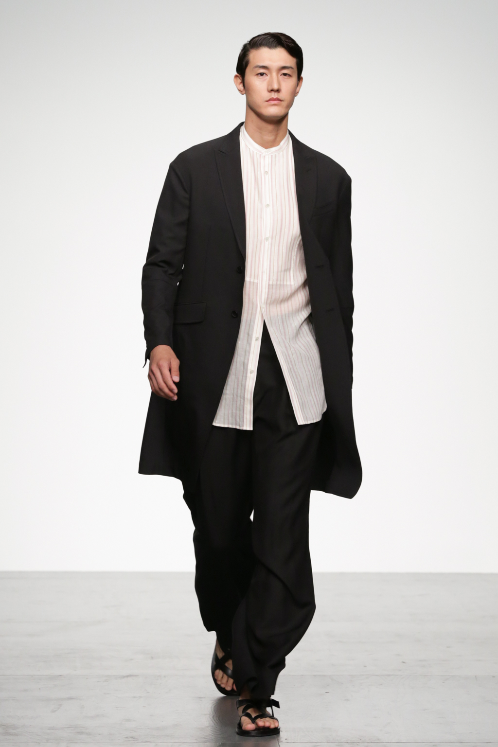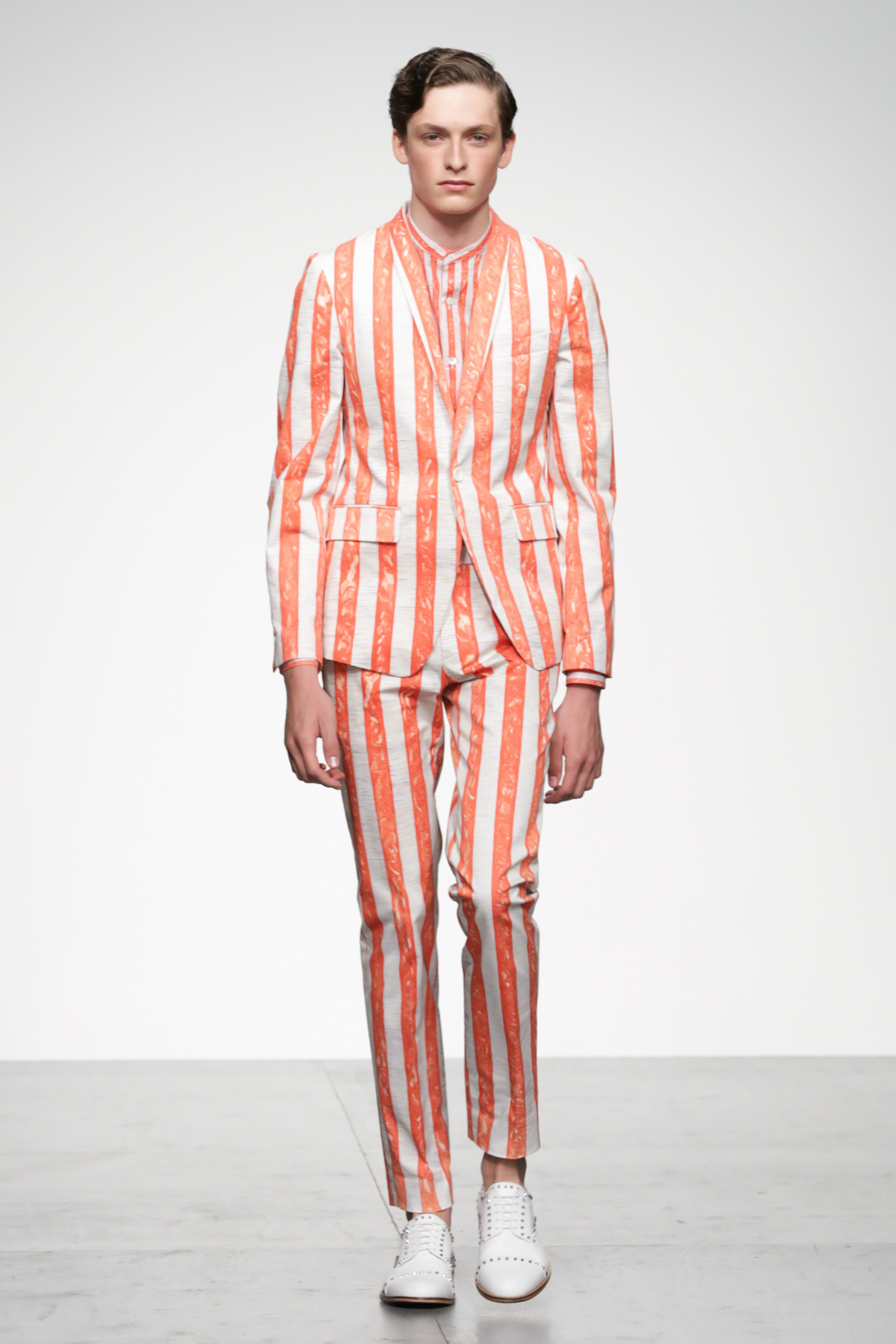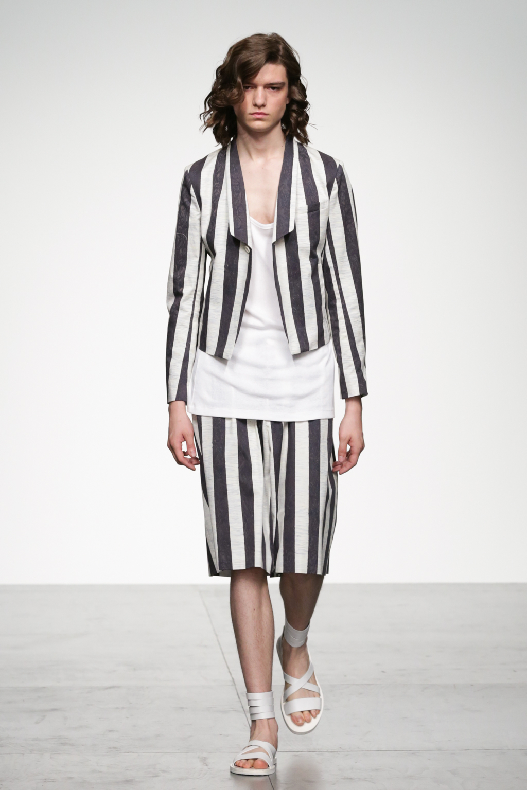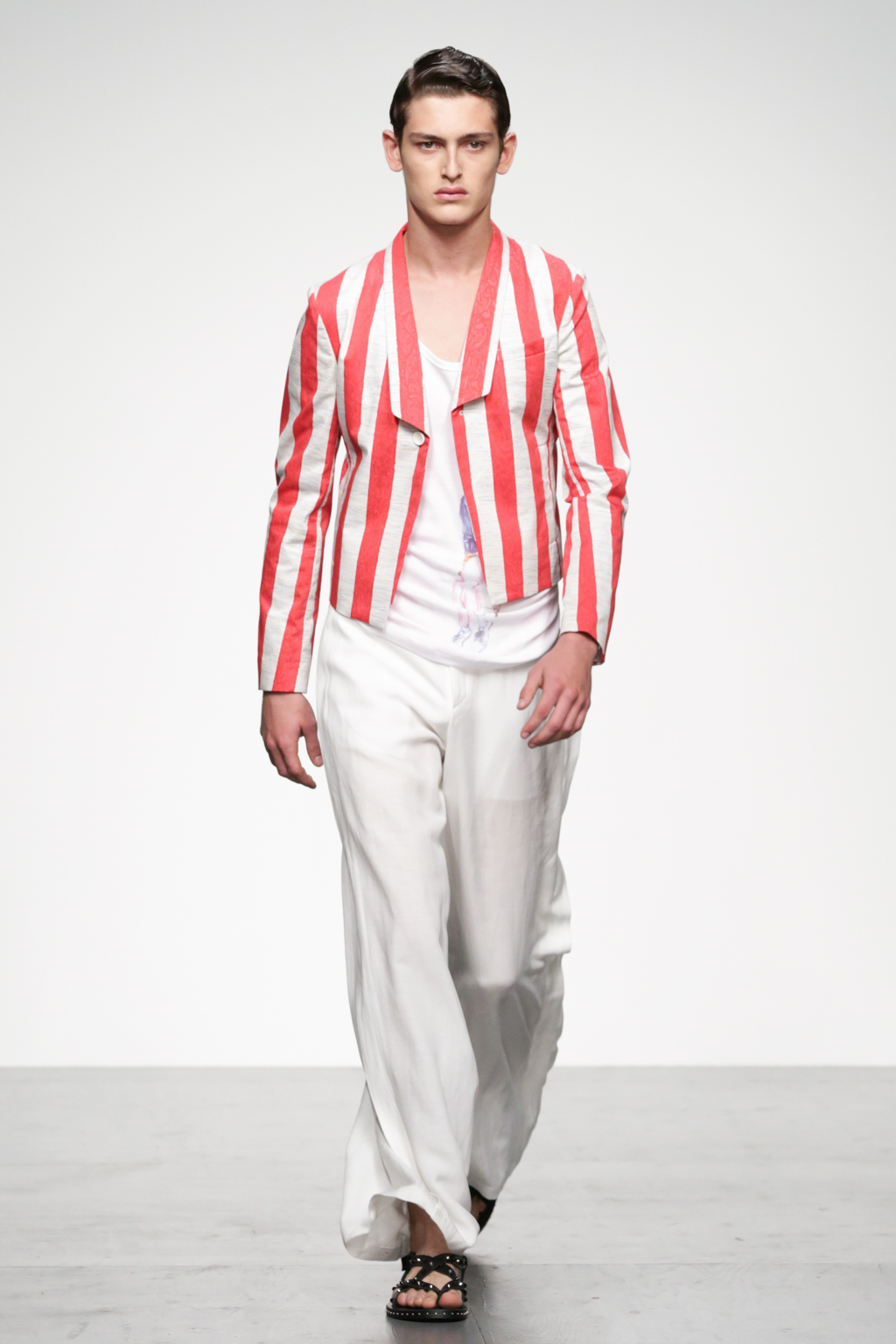 1920s-style wide-striped two-piece suits had rounded shoulders and shawl lapels, paired with sliders and illustrated T-shirts for a casual look. Jackets with a similar sillouette were smartened up in black and navy, styled with shirts and peg trousers. In rejecting the super slick norms of the business suit, Song has managed to refresh formal wear with a rounder silhouette.