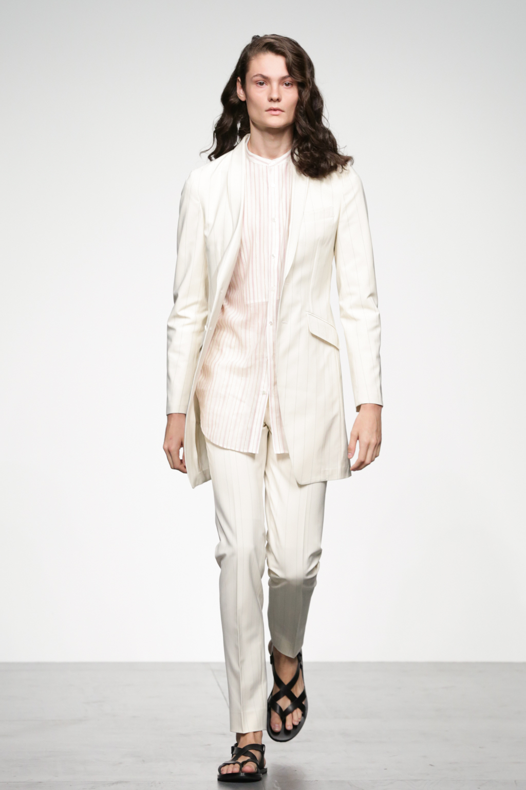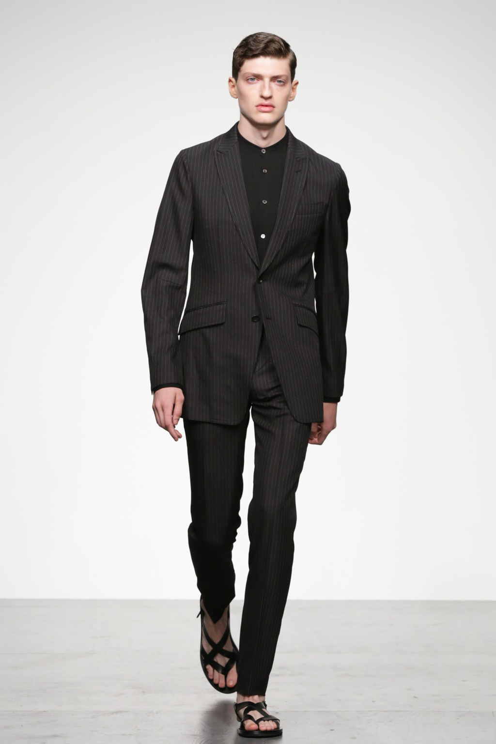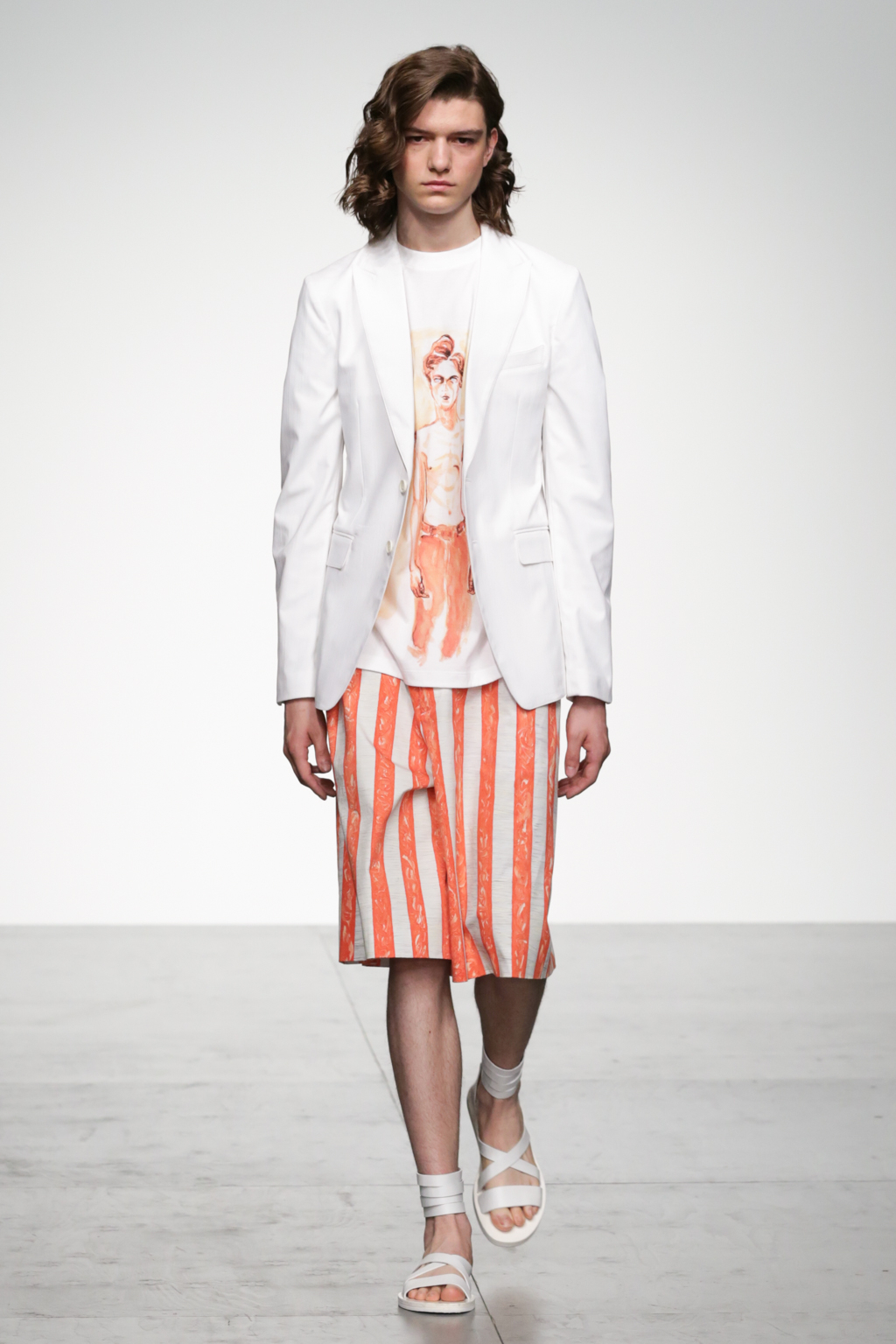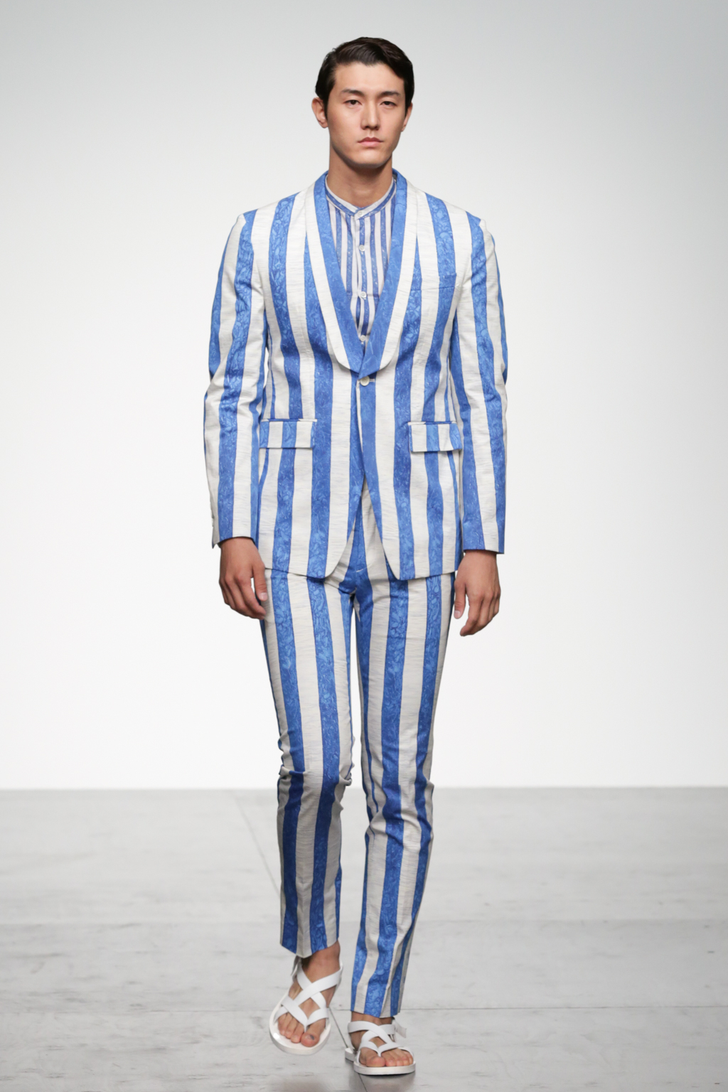 1920s-style wide-striped two-piece suits had rounded shoulders and shawl lapels, paired with sliders and illustrated T-shirts for a casual look. Jackets with a similar sillouette were smartened up in black and navy, styled with shirts and peg trousers. In rejecting the super slick norms of the business suit, Song has managed to refresh formal wear with a rounder silhouette.