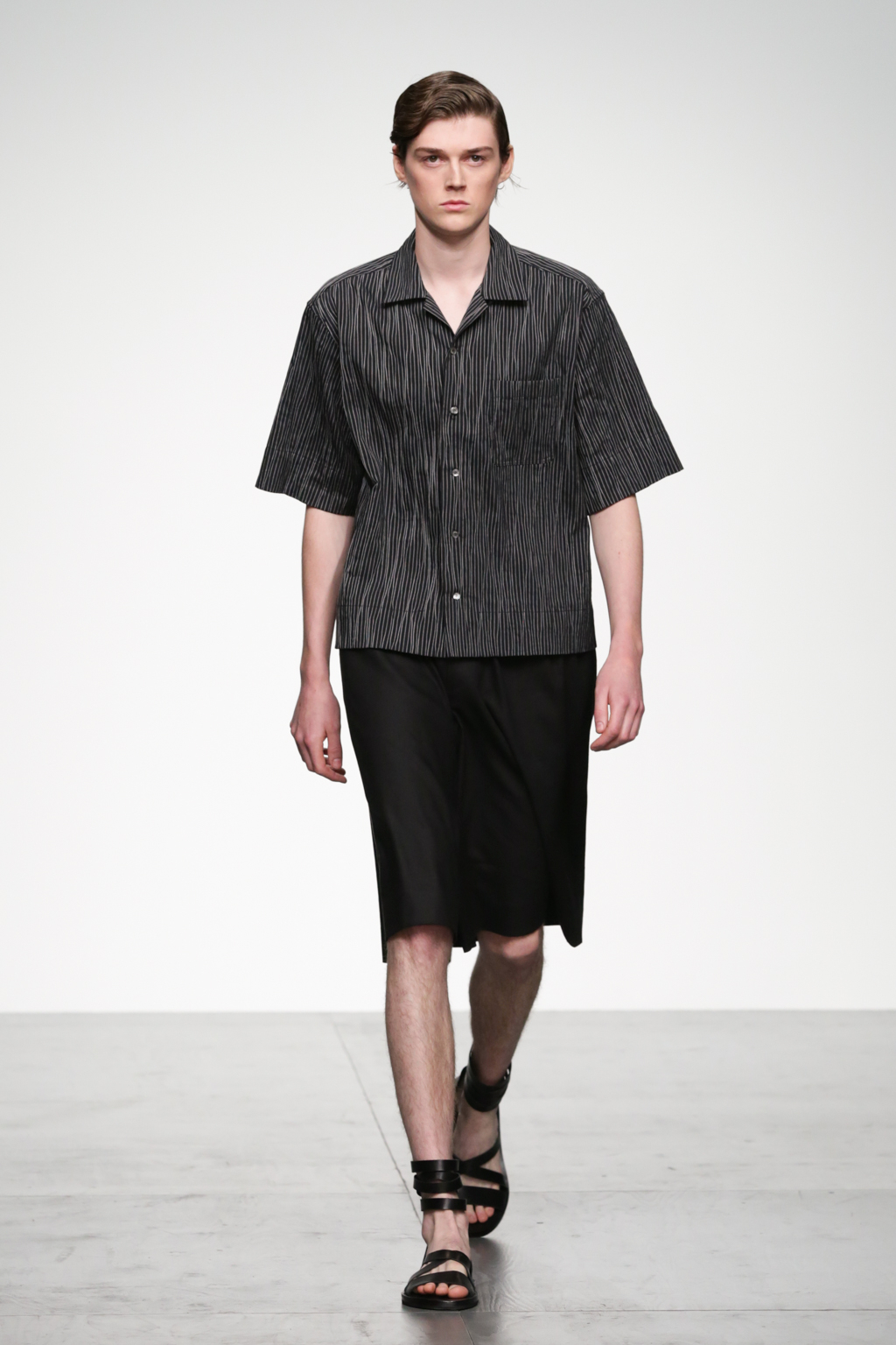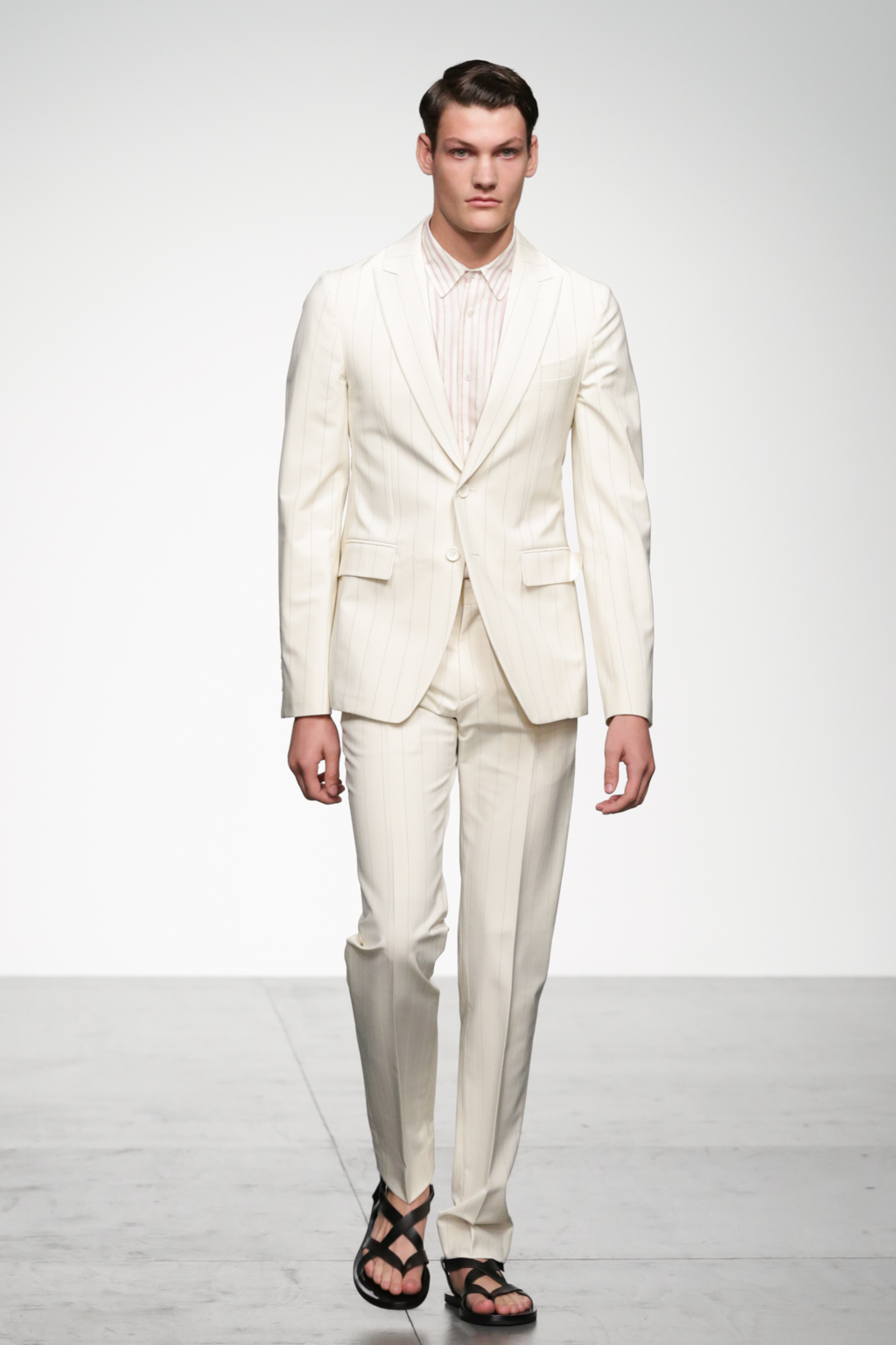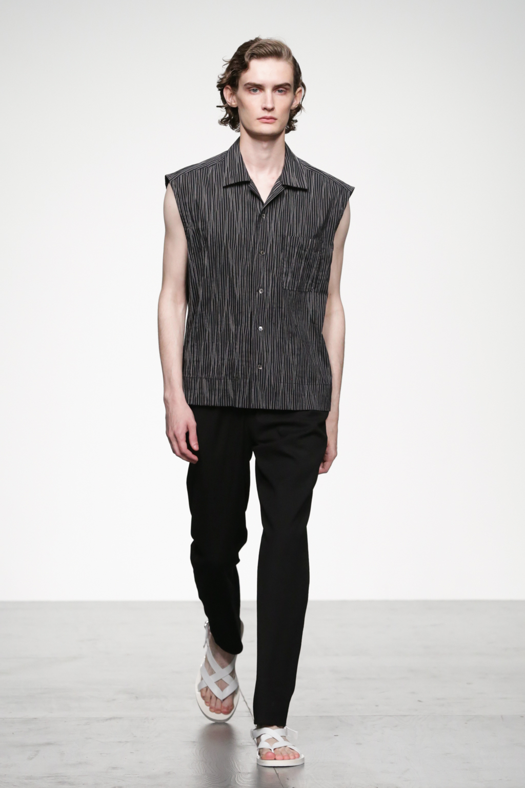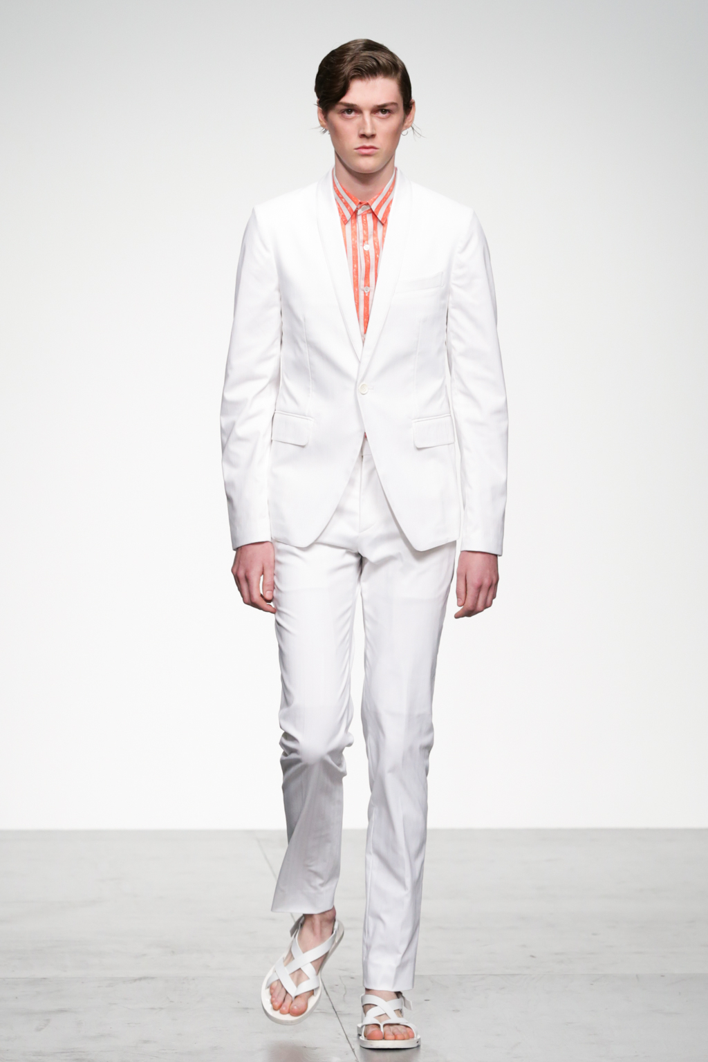 1920s-style wide-striped two-piece suits had rounded shoulders and shawl lapels, paired with sliders and illustrated T-shirts for a casual look. Jackets with a similar sillouette were smartened up in black and navy, styled with shirts and peg trousers. In rejecting the super slick norms of the business suit, Song has managed to refresh formal wear with a rounder silhouette.