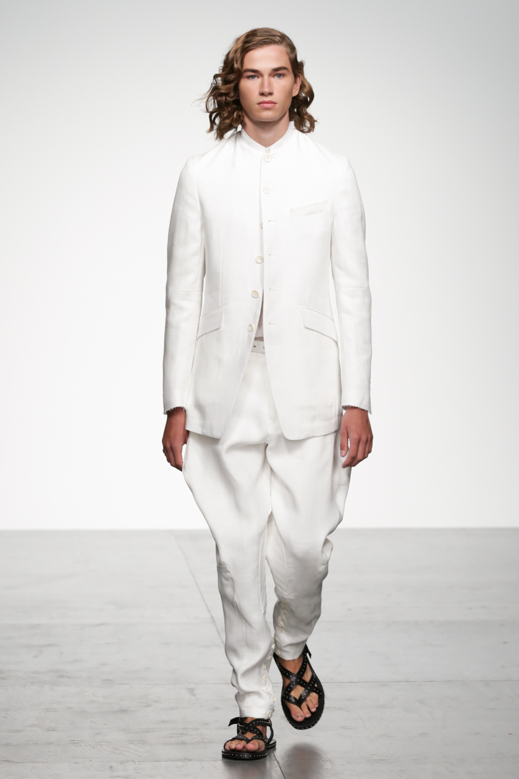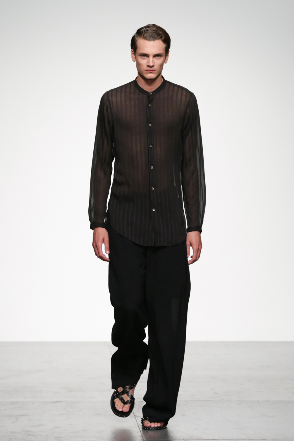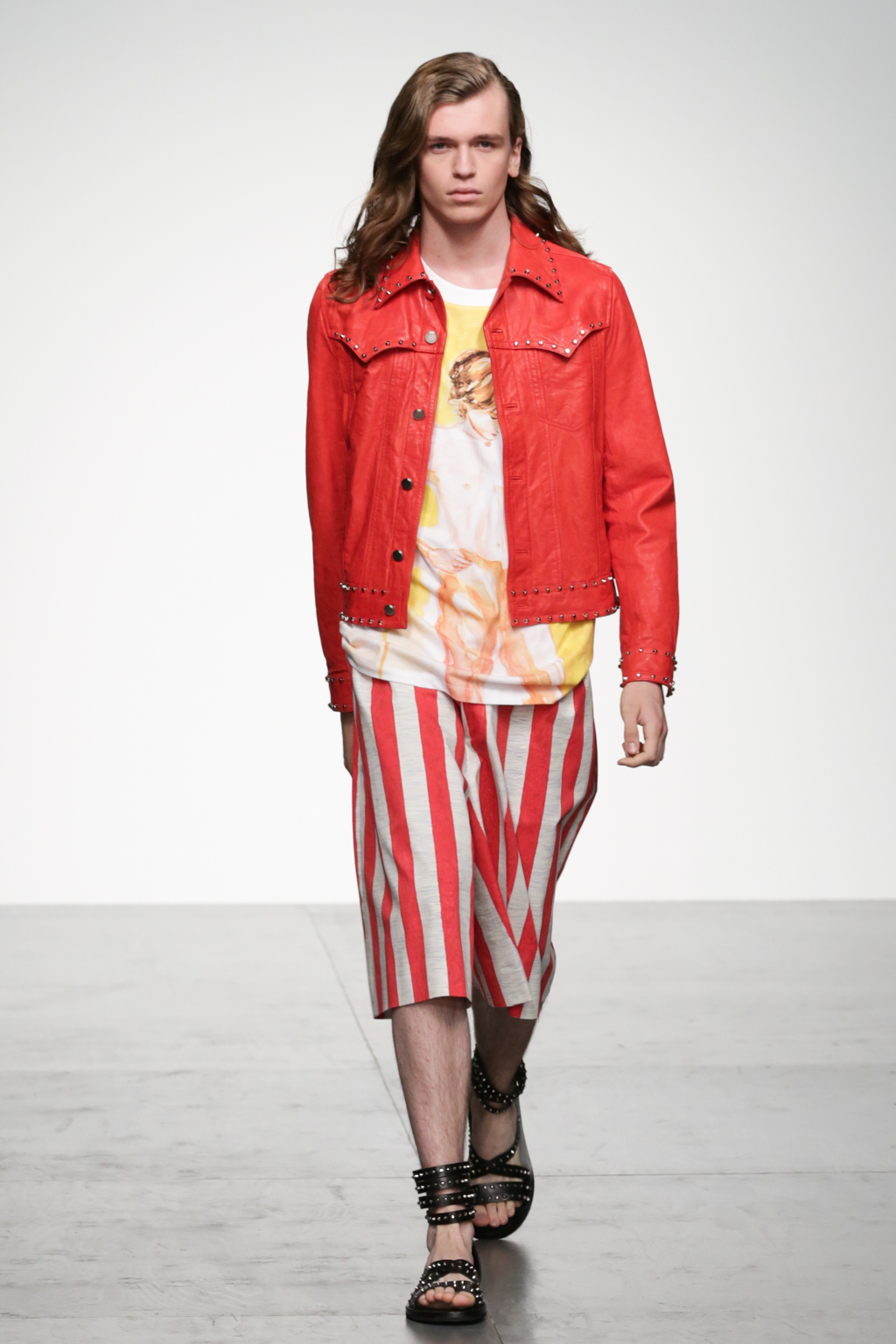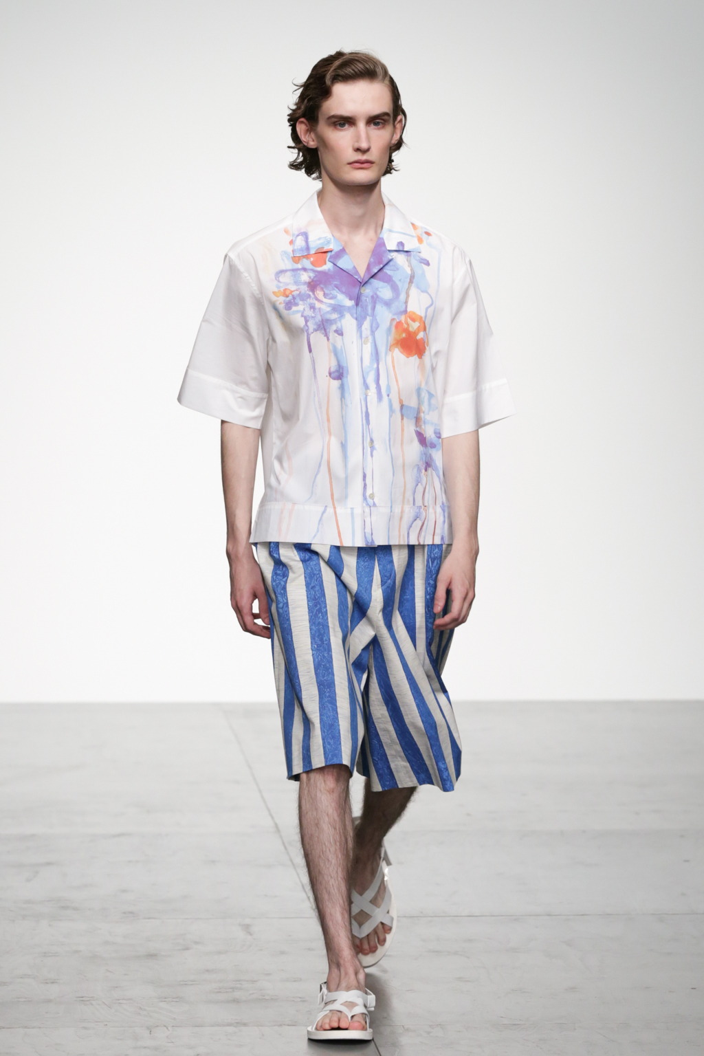 1920s-style wide-striped two-piece suits had rounded shoulders and shawl lapels, paired with sliders and illustrated T-shirts for a casual look. Jackets with a similar sillouette were smartened up in black and navy, styled with shirts and peg trousers. In rejecting the super slick norms of the business suit, Song has managed to refresh formal wear with a rounder silhouette.