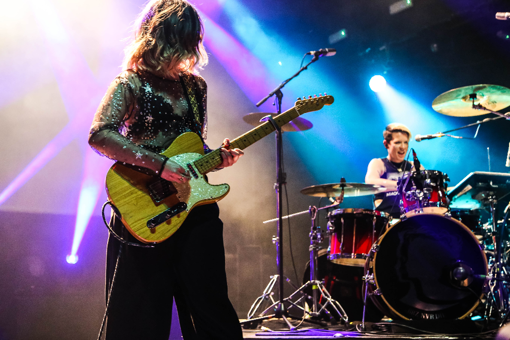 Last night at Koko marked Stina Tweeddale and Cat Myers’s biggest show to date. The Scottish duo have been growing in popularity over the past few years, but they are still getting used to headlining rather than supporting. Tweeddale likes to describe their sound as “scuzz-pop”, but it could also be thought of it as fem-pop, grunge or “venom-sweet”.