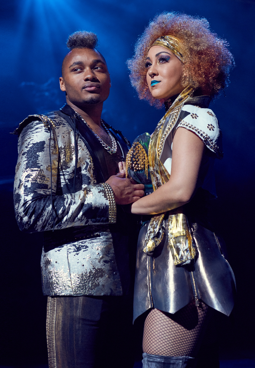 There are also memorable duets from supporting characters, like Falco (Rob Fowler), the ruler of Obsidian, and his partner Sloane (Sharon Sexton), who in a riotous moment in the first act wonderfully stage a scene of hopeless seduction with perfected comic timing. Perhaps the best voices, however, are those of minor characters Zahara (Danielle Steers) and Jagwire (Dom Hartley-Harris), who deliver Two Out of Three Ain’t Bad and Dead Ringer for Love with such effortless power and emotion. With such a demanding and vocally dynamic score, the whole ensemble is collectively strong, scattered with exceptional new talents making their West End debut.