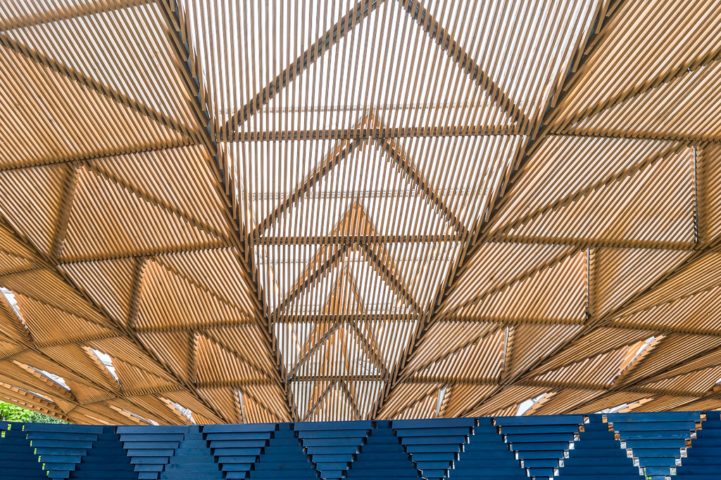 Kéré’s design might seem a bit like a fairy tale – a magical faraway tree for the modern day – but it also exudes a sense of real presence and precision. It’s reported that the team of engineers and builders that puts together the pavilion every year was impressed by Kéré’s millimetre-accurate design, which uses geometric rigidity to create beautiful flowing lines. The design is deceptively simple; the walls and the roof with its open skylight are architecturally complex and finely balanced.