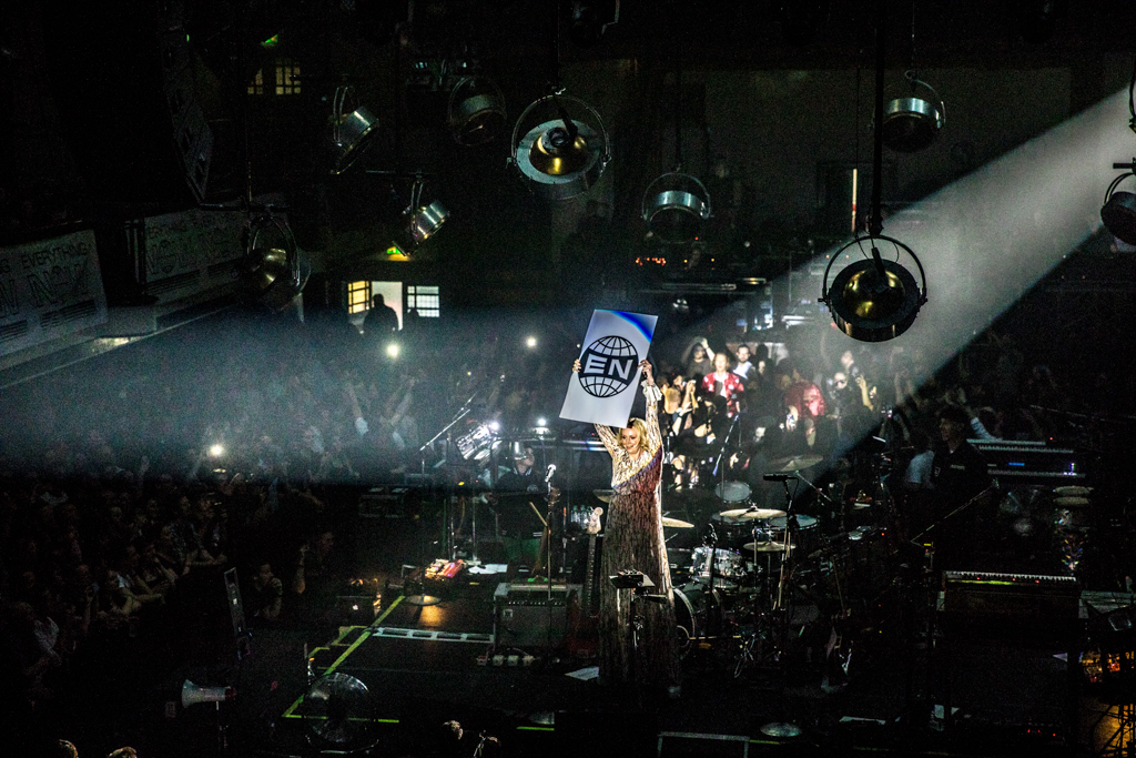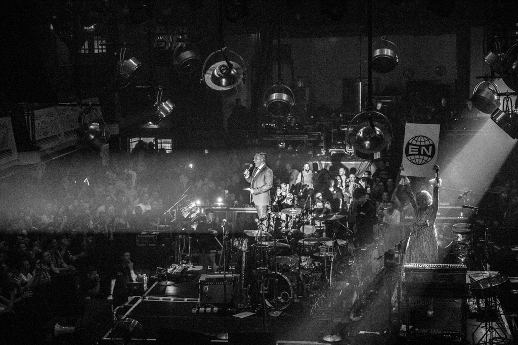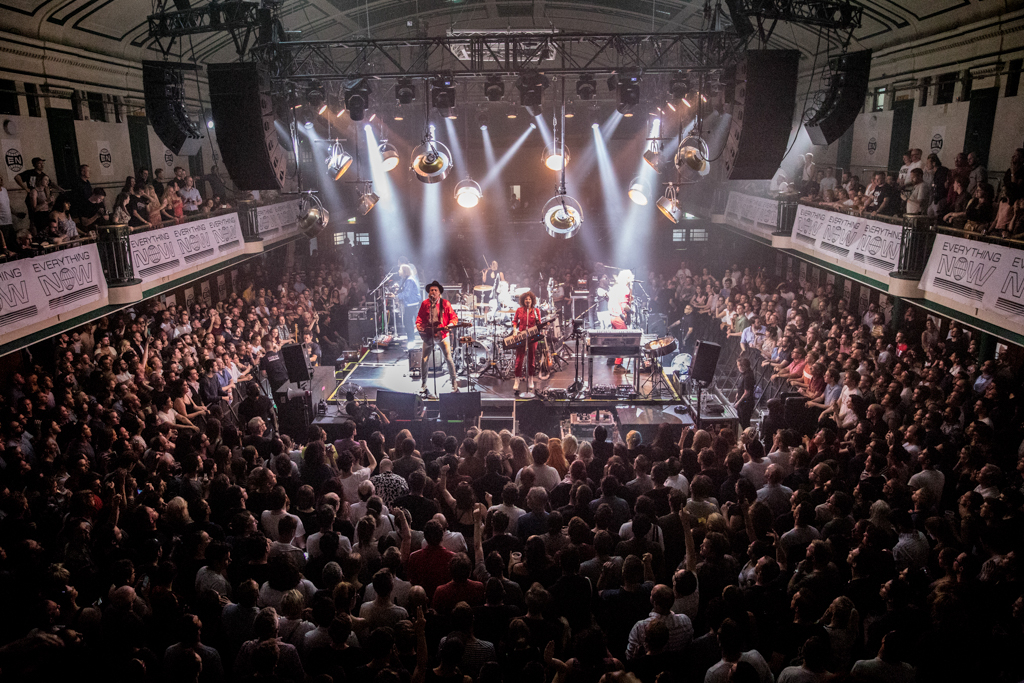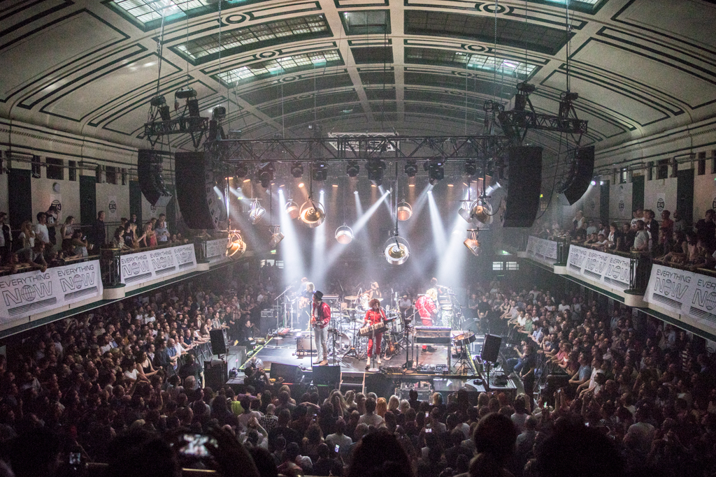 Unusual venues aren’t uncommon for Arcade Fire. Ten years ago, when they were one of music’s best-kept secrets, they would play in a church in Westminster; now they choose York Hall, temple of boxing and wrestling, to perform in front of a privileged crowd of fans and VIPs (Coldplay’s drummer to my left, Jude Law to my right, and KOL rumoured to be all in attendance). The stage is in the dead centre, the audience all around it: just like a ring. Presented in classic boxing fashion – announcer in a suit and a placard-holding girl walking around – the band starts with Everything Now, lead single and title track of their new album.