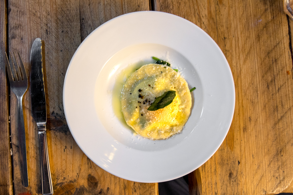 Organic Egg Yolk Raviolo, with spinach, butter and sage sauce, and a dressing of parmesan, is another classic pairing of flavours. The iron-laden spinach keeps the luxurious elements of the dish from running riot, and our egg yolk is cooked to runny perfection. It could do with being a little smaller (by the end of the five courses, a fair number of guests look as if they might need to roll their way home) but there’s something endearing about the bright-eyed optimism of the portions.