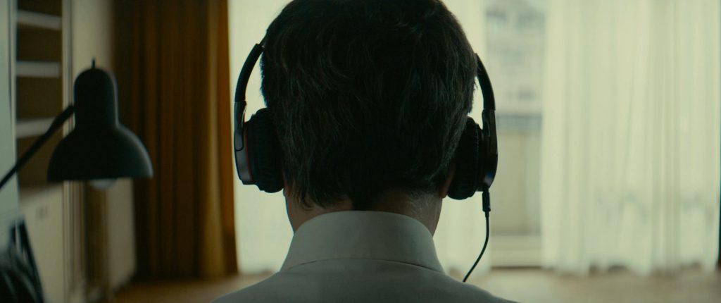 In a captivating political thriller, Thomas Kruithof’s seamless camerawork follows the tribulations and misfortune of his protagonist, Monsieur Duval, who struggles with alcoholism. After a near mental breakdown whilst working as a bookkeeper in a soulless Paris company, we fast-forward two years to a lonely, unemployed, yet sober Duval who fills his days with unsuccessful interviews and AA meetings. His bland and monotonous routine is suddenly shattered when he is employed by the enigmatic “Clément” who drags him down into the knotty underworld of phone-tapping, eavesdropping and political cover-ups. Initially, his job involves supposedly working for the secret service: transcribing tapes of tapped phones on a typewriter in an anonymous dilapidated apartment rented out by Clément. The routine of his day is rigid, ordered yet ideal for his recovery; starting at nine and finishing at six, this rhythmical pattern is literally echoed in the continuous tap of the typewriter reverberating against the bare and colourless walls.