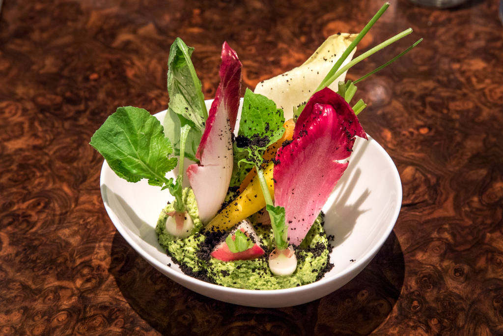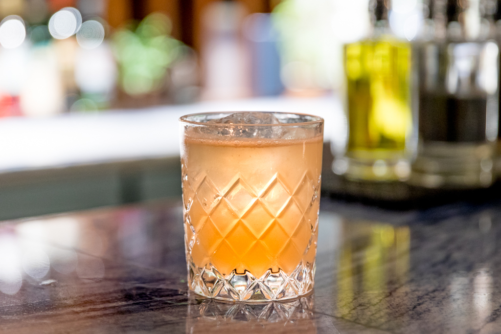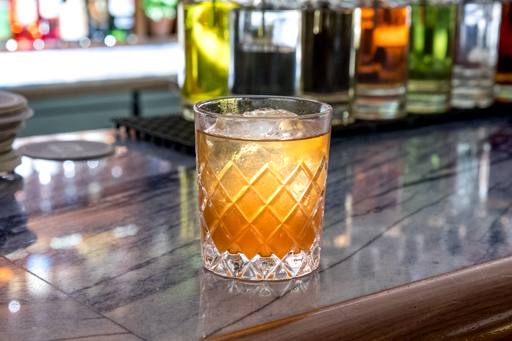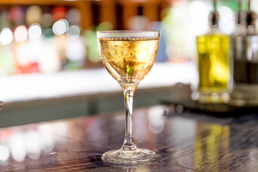 The bar is sumptuous in its appearance, with art-deco patterned banquettes, polished metal surfaces and a gorgeously intricate laser-cut screen separating it from the restaurant. But there’s a hint of mischief in the surroundings as well – surreal flower-strewn portraits hang on the walls, the music is jaunty swing and the bartenders are dressed in distinctly Hackney-esque denim shirts and aprons. Not a white jacket or bow tie in sight. Bar manager Daniel keeps the atmosphere light with cheery explanations of the menu and an obvious enthusiasm for the bar’s philosophy.