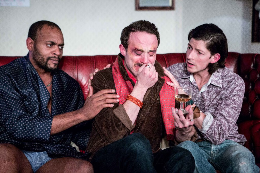 The play opens with Tony sat with his friend William on the worn and conveniently rust-coloured sofa in his Kentish Town flat. They wait for Robert, the new cleaner Tony has insisted on hiring, to turn up. Elliot Hadley who plays William (and later Jurgen) masters his role as the boisterous, flamboyant Scouse, whose vulgar profanity and uncomfortably vivid sexual descriptions will have theatre-goers in fits of laughter and never looking at a doughnut the same way again. William insists their new cleaner will essentially be their houseboy, joking about the hierarchical positions in the flat with tragic irony as it is exactly the ranking between Greg, Tony and Robert that engenders a toxic love triangle. When Robert turns up he is doe-eyed, gorgeous and endearingly naïve. His politeness wins over even the austerity of Greg who pursues a four-month affair with the Adonis-like cleaner behind Tony’s back. It is at this point that Elyot exposes the unwritten truth of polyamorous relationships – unveiling what happens when love and sex and their supposed separateness is overturned, and whether it is ever truly possible to love two people at once.