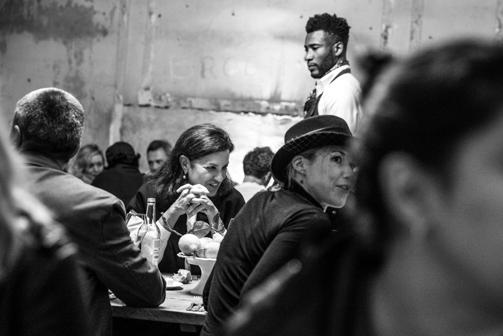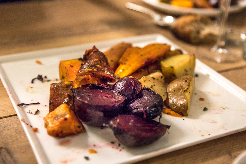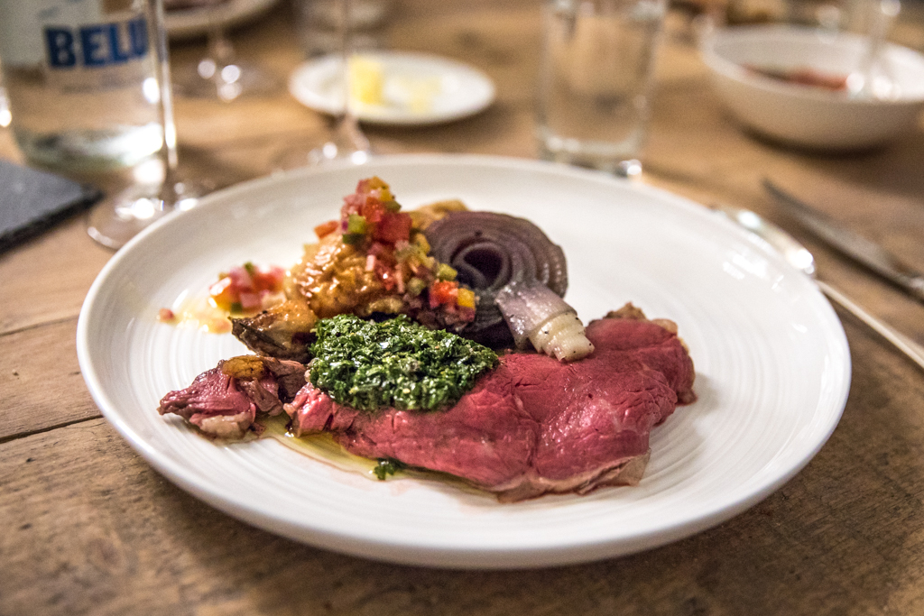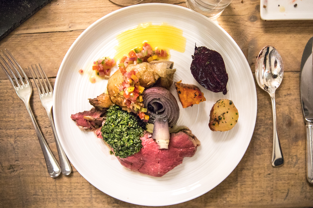 If the wine stole the show for the starter, the food did it for the main. Served with a non-vintage magnum rosé, the rib eye and chicken course came with some of the most intense vegetables you could possibly imagine. Over ten hours of cooking in the ground – covered – made them as smoky as they can get within the sphere of enjoyment. The vegetables maintained their own texture but their flavours shuffled and combined: the beetroot tasted of carrots, the carrots of sweet potatoes – without losing their identity. This evening also saw a first for a dining environment: the chicken meat was more interesting than the beef (smaller in size, it took more smokiness whilst hanging over the pit fire).