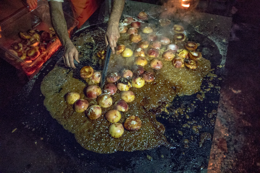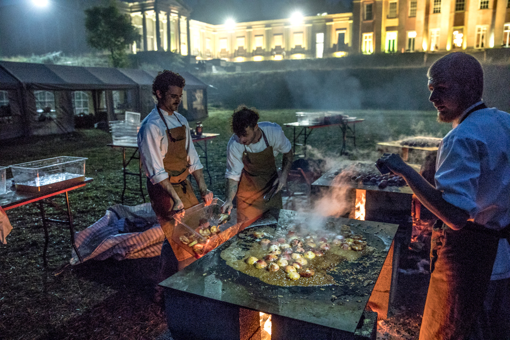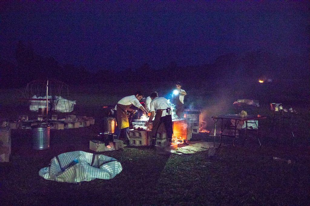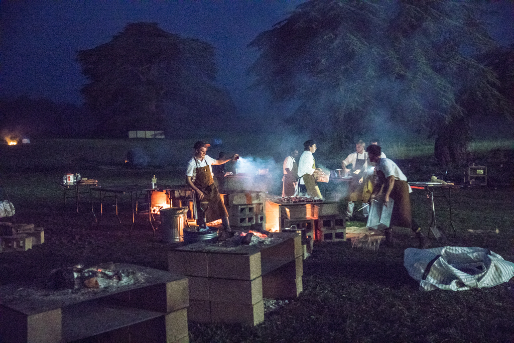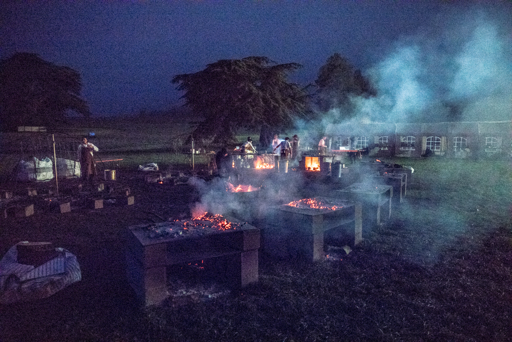 We took a little break and walked to the cooking area in the field. It was pitch black, the fire the only source of light. The cooks were preparing plums and peaches over the hot metal surface. The smell was amazing, and the sound of the juices leaving the heart of the fruit and melting with butter a symphony. Chef Mallmann appeared from the darkness, checking on his loyal brigade. One of the cooks used his phone to shed some light. It couldn’t be more fascinating, with the Grange looking majestic as the backdrop. Another two guests came from the palace to check out the fires; Mallmann began to take care of the burning wood and ashes in the ovens. We had a brief chat about the dessert, whereas the other couple asked about his upcoming London restaurant, which he hopes to open by the end of next year (permits aren’t easy to get for what he wants to do).