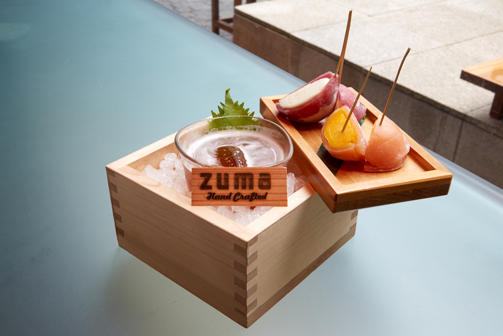 Zuma opened in 2002 and it still is one of the trendiest restaurants in Knightsbridge. The Champagne Gogo menu I’m here to sample takes its name from the Japanese word for afternoon, Gogo, and Zuma pitches it as a high-end alcoholic take on afternoon tea. There’s six cocktails to choose from and two mochis.