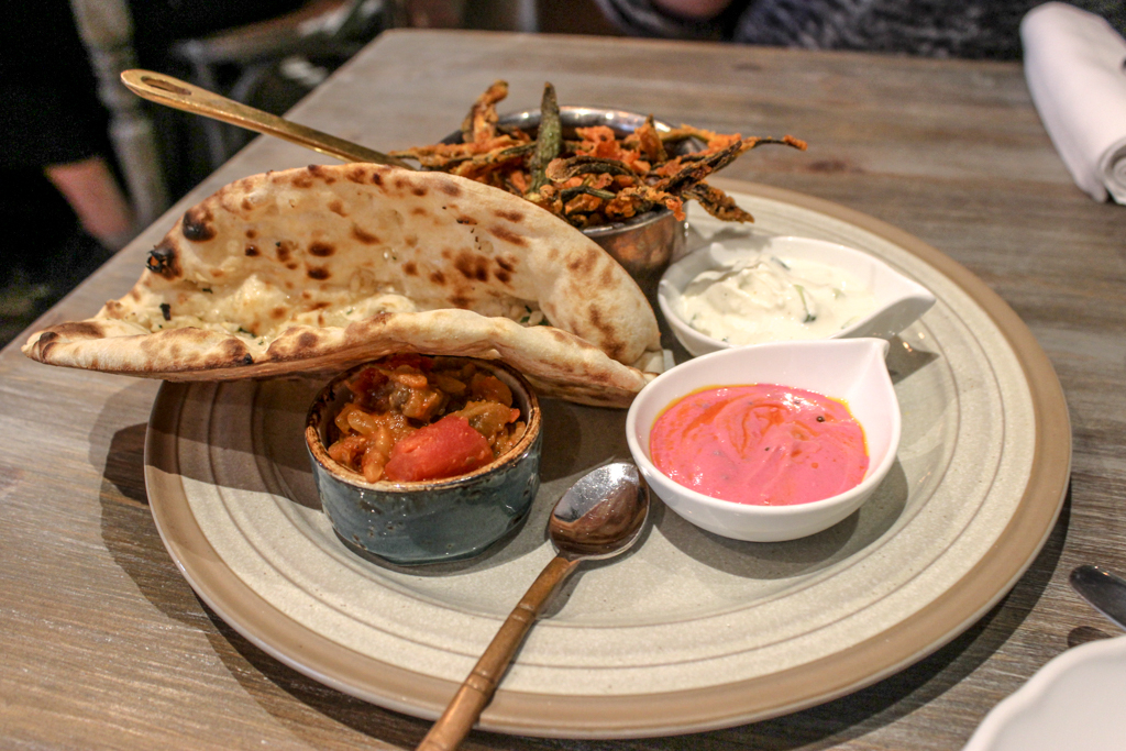 Lokhandwala is a somewhat mysterious and intriguing restaurant nestled in the heart of Charlotte Street. Walking inside, you find yourself in a charming setting, decked out with opulent interiors and leaving you feeling like you’ve stepped through to another time. Once you’re sat down and handed menus, all becomes clear as some context is given to your surroundings through a detailed narrative of how a young Lady Charlotte Louisa Fitzrovia fled to Mumbai for love before returning to 93 Charlotte Street to live out the rest of her days. So it comes as no surprise that the food offer has taken on an Anglo-Indian theme and seeks to combine the best of both worlds. This became apparent as our eyes skimmed down the menu, spotting dishes such as Masaledar Fish and Chips, Yorkshire Pudding Lokhandwala Style and Blue Stilton Naan with Truffle Oil.