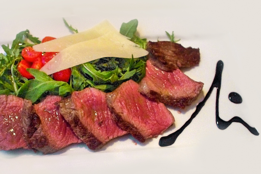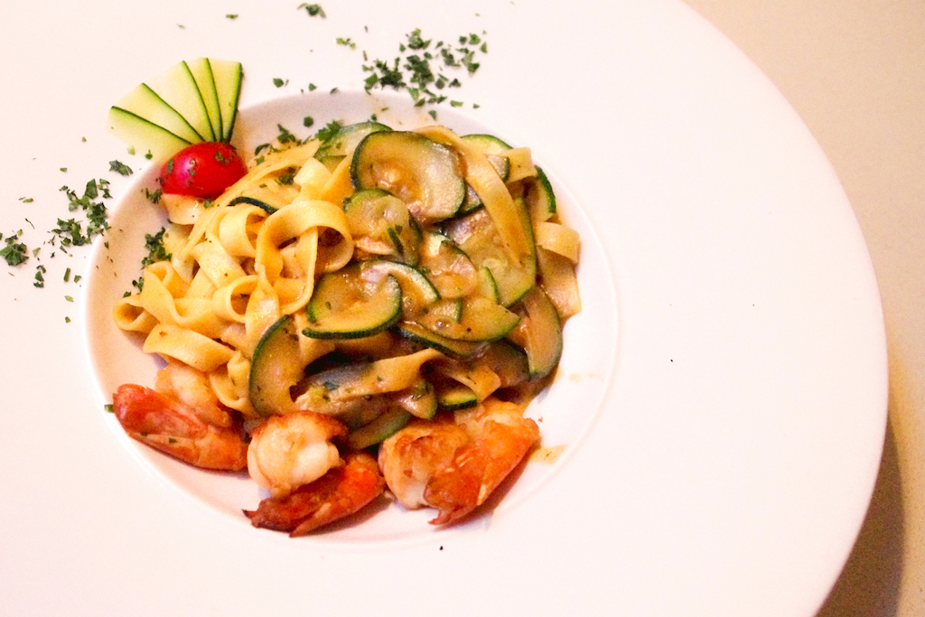 The food menu is nicely put together, offering family recipes, a lavish wine list and rotating specials to suit the season. We begin with a variety of pasta and antipasti. Le Melanzane alla Parmigiana is a hearty choice, with layers of deep-fried aubergines coming coated indulgently with tomato sauce, parmesan, mozzarella and fresh basil. Le Tagliatelle Zucchine e Gamberi comes beautifully presented – the homemade pasta dashed with courgettes and prawns and sautéed with brandy, parsley and lobster sauce. Oozing with flavour, both dishes are delicious when devoured with a selection of La Tagliata’s home-baked focaccia.