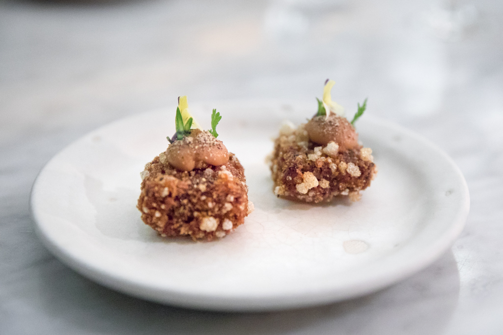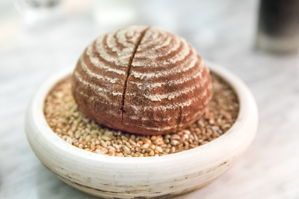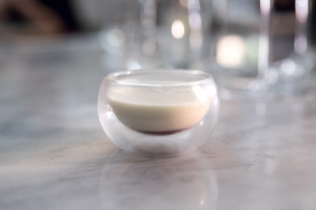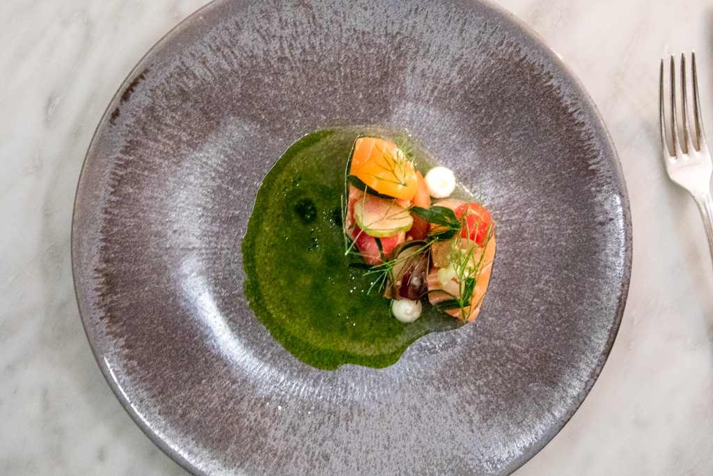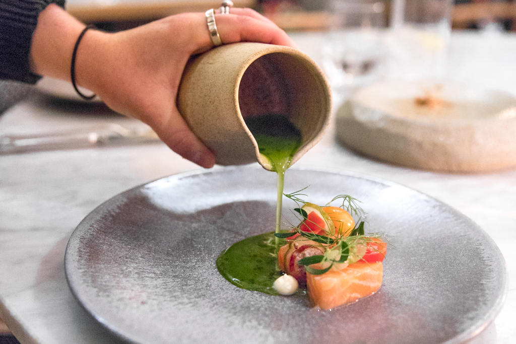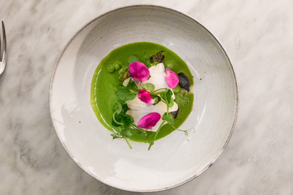 The five-course tasting menu costs £65 and it’s spectacular. There are snacks to start with: the Crispy Cod Skin with dill emulsion, oyster and paprika; the Pig Cheeks with apple purée and mushroom powder; and their IPA sourdough bread loaf with marmite butter and pearl barley. They are all delicious and served with perfect timing that makes you forget the wait for the first dish. We also have a chat with head sommelier Fred Marti (ex Atherton too), a Frenchman with unmistakable passion for all things Japanese. It’s clear he knows what he’s doing – which sadly isn’t very common – and I trust him with the pairings for the entire meal. He comes back with a refreshing, unfiltered glass of Sugihara sake – one of the smallest breweries in Japan, from the Gifu prefecture.