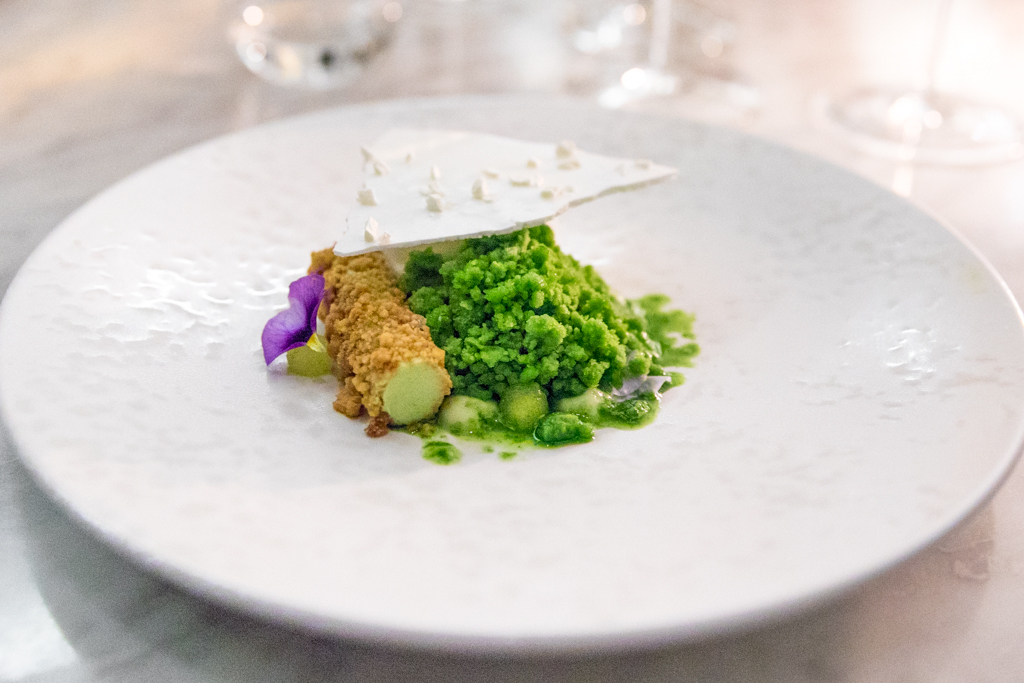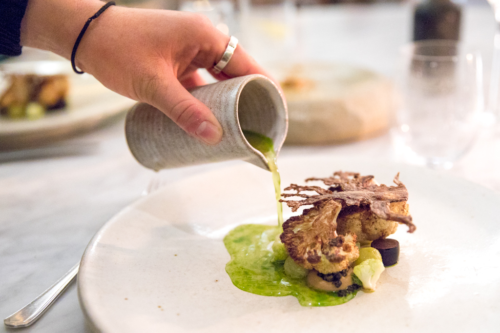The opening course is the Trout, Horseradish, Gooseberry and Tomato; it has all the freshness and punch of the herbal elements, and the Japanese fermented rice wine is a wise pairing for the cured fish. It continues with Westcott’s signature dish, Yeasted Cauliflower, Raisins, Capers and Mint, which could also be renamed Ode to Cauliflower. The white vegetable is presented in four different styles and textures: the golden crispy slices on top; the pan-seared fondants; the little, blanched florets; and the yeasted purée at the bottom. Raisins, capers and mint add complexity and a fresh touch to the overall flavour.