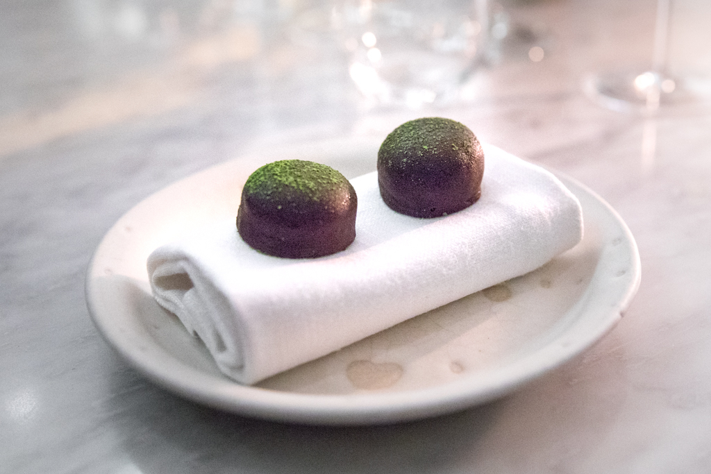 The tasting menu ends with Sheep’s Yoghurt, Apple and Dill, one of the most delicious fresh desserts I’ve had in a long time. As I enjoy the pudding, there are two glasses of sweet wine I can play with: a Domaine de Souch Jurançon Moelleux Cuvée Marie Kattalin 2004 – similar to a sauternes although different in grape variety – and a yuzu sake.