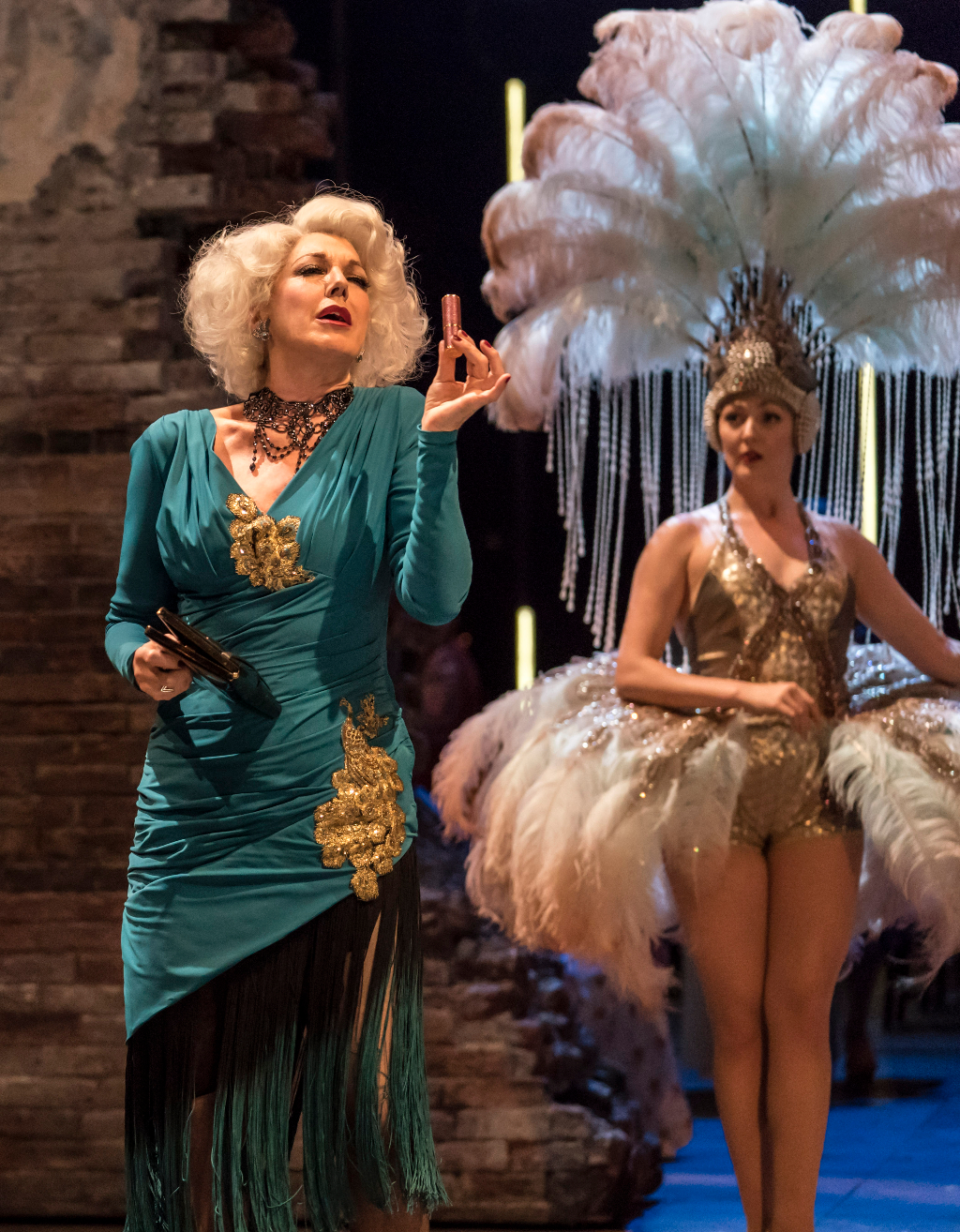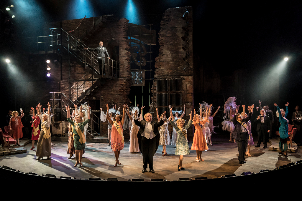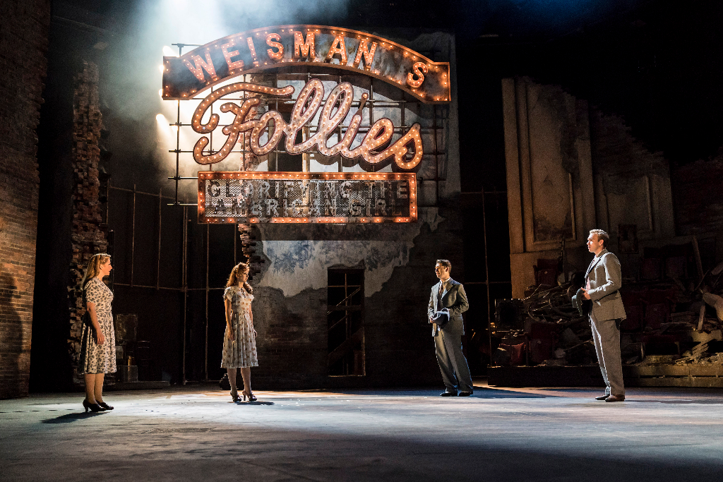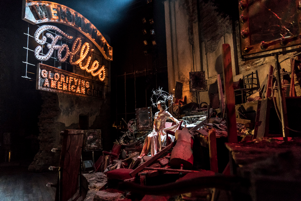 It’s 1971, New York, and a gaggle of well-groomed women are arriving at the Follies chorus girls’ reunion. Entering the dilapidated Broadway theatre in which they once put on their world-famous shows, they brush shoulders with the ghosts of their past selves. In Dominic Cooke’s new production of Stephen Sondheim’s classic musical, the collision of past and present, of fresh and faded provides a glorious aesthetic that oozes pre-war glamour served up with nostalgic poignancy. It’s a place where crumbling brick wall gives way to sumptuous showgirl costumes. Where sequins in the darkness upstage glint like the embers of memories.