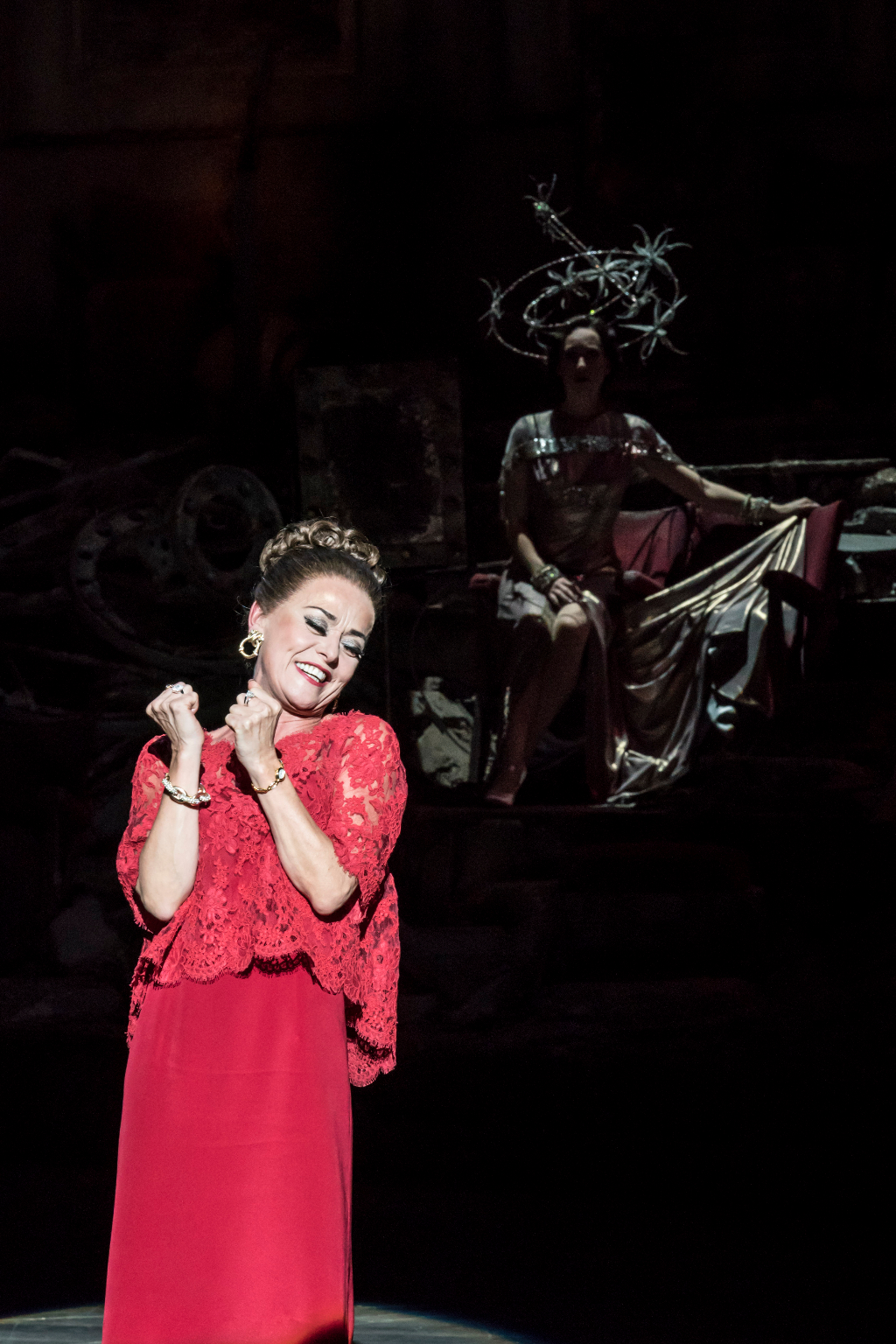 In a flawless catalogue of songs, I’m Still Here still manages to be one of the standouts, showcasing Tracie Bennett’s charisma and anguish as movie star Carlotta. Who’s That Woman is a barn-stomping dance number that pulls out all the stops. The ethereal operatic beauty of One More Kiss roots septuagenarian soprano Josephine Barstow’s Follies girl in a still more distant heyday than the others. The Story of Lucy and Jessie is a whirlwind affair of pulse-quickening tap, high kicks and clever patter lyrics.
