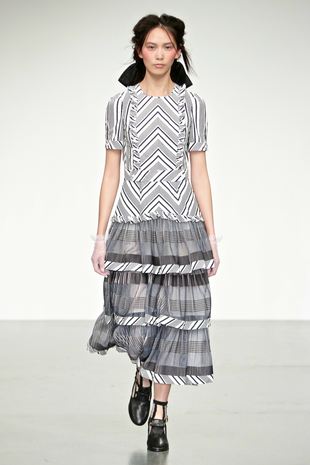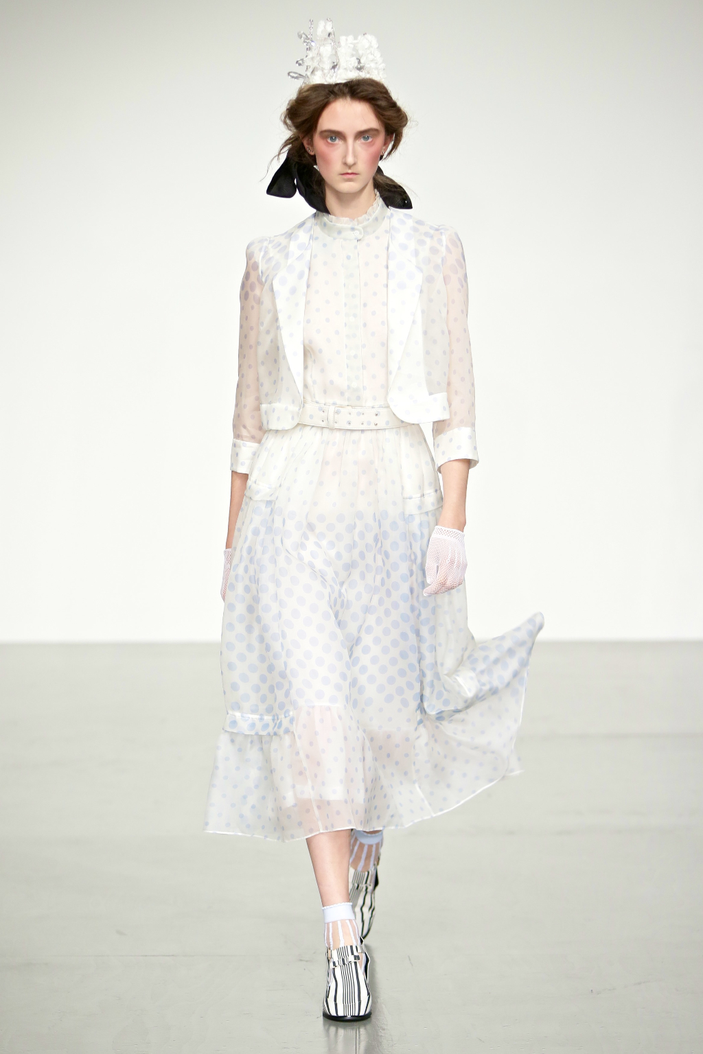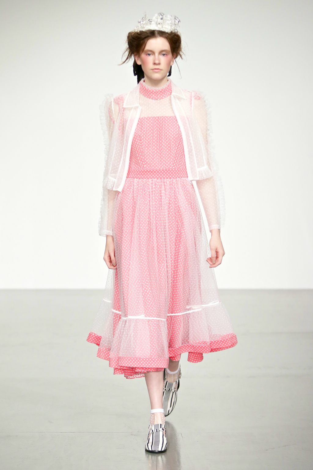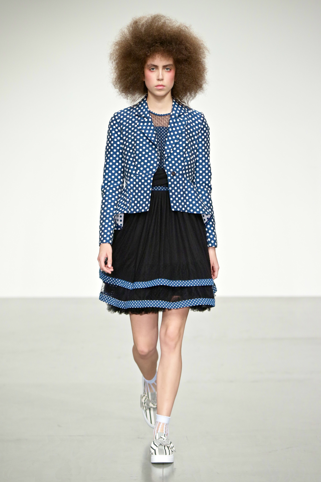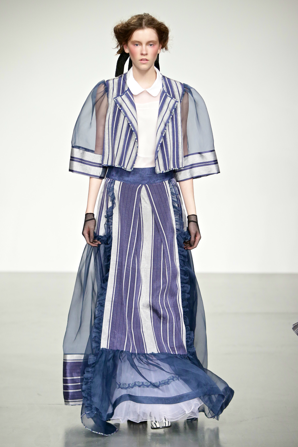 Stark bold patterns of polka dots and stripes sit alongside flowing ruffled skirts and delicate heart-shaped overlays on mesh and tulle. Feminine pussy-bow collars and ribbons are brought into the modern day with sporty slip-on sneakers and bomber style silhouettes. The Victoriana influence is strong throughout the collection, which again references the time period of Lady Musfik’s life.